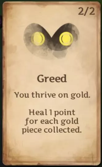 贪婪:收集金币时为你恢复1点生命值。等级1时,每收集2枚金币或金块恢复1点生命值;等级2时,每收集1枚金币或金块即可恢复1点生命值。