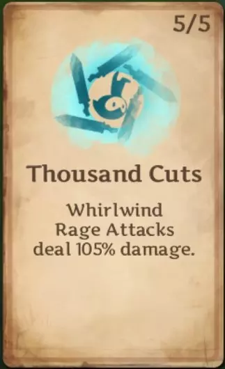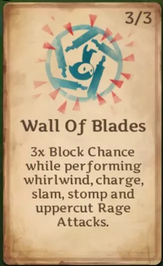 刃墙:执行 rage 攻击时会提升你的格挡几率。在我看来,这是最实用的技能之一。当你的格挡卡片升到满级时,你将拥有25%的格挡几率,因此该技能会将格挡几率提升至至少75%,大幅降低受到的伤害。若格挡等级达到10级,再装备一枚+1.8%格挡的戒指、一副+3.0%格挡的手套以及一件使格挡效果提升14%的胸甲,你的格挡几率就已经能达到33.9%。即使使用这些并非最佳的装备,在发动 rage 攻击时你也会近乎无敌。