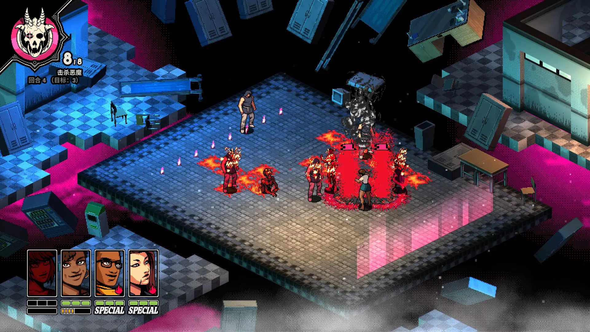 【僵尸头之球】Boss。 会拖着身体在舞台上进行直线范围攻击,随后召唤僵尸和 grunt 小怪。你可以通过留意直线范围攻击的结束位置来规划下一回合,从而获得角色站位的预判信息。 如果僵尸未被消灭,它们的头颅会被吸入球体并为 Boss 恢复生命值。 第 6 周,无图片,因图片包含不可避免的剧透内容。 【锅炉】Boss。 会生成四个目标点,同时发动强力的单体攻击和范围较广但威力稍弱的范围攻击。当目标点被击中后,它会发出警告:房间中心将出现四次单体即死攻击,同时中心区域还会有大型击退范围攻击。 下一回合,房间中心会出现一个巨大的水龙头。每次生成敌人时发动一次攻击会推进战斗,但发动多次攻击会降低锅炉热度。获胜需要发动四次攻击,进度通过水龙头的颜色来显示。我是色盲,所以玩的时候开了滤镜,但我记得最终颜色是粉色。锅炉热度不是进度指标! 保持锅炉热度较低是优先事项,但并非推进战斗的必要条件。从未有人让锅炉热度达到100%,所以没人知道会发生什么。 我讨厌这个 boss,太烂了 第五周