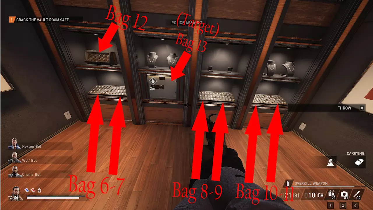结局 无论你选择强攻还是潜行,在这个任务中都能拿到所有袋子,所以不必纠结于潜行或强攻,选你更喜欢的方式就好! 我做这个指南主要是为了介绍保险库内的袋子,因为其中有些很容易被漏掉。 希望你能拿到所有东西,并解锁收集全部战利品的游戏内成就。 如果我不小心漏掉了什么,欢迎告诉我,谢谢! 祝你抢劫愉快。