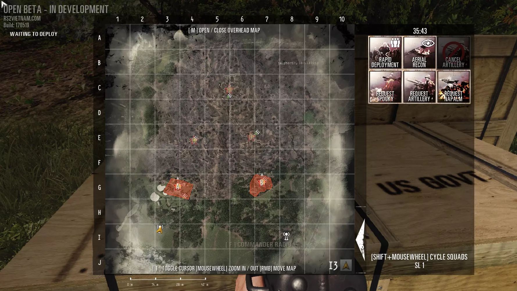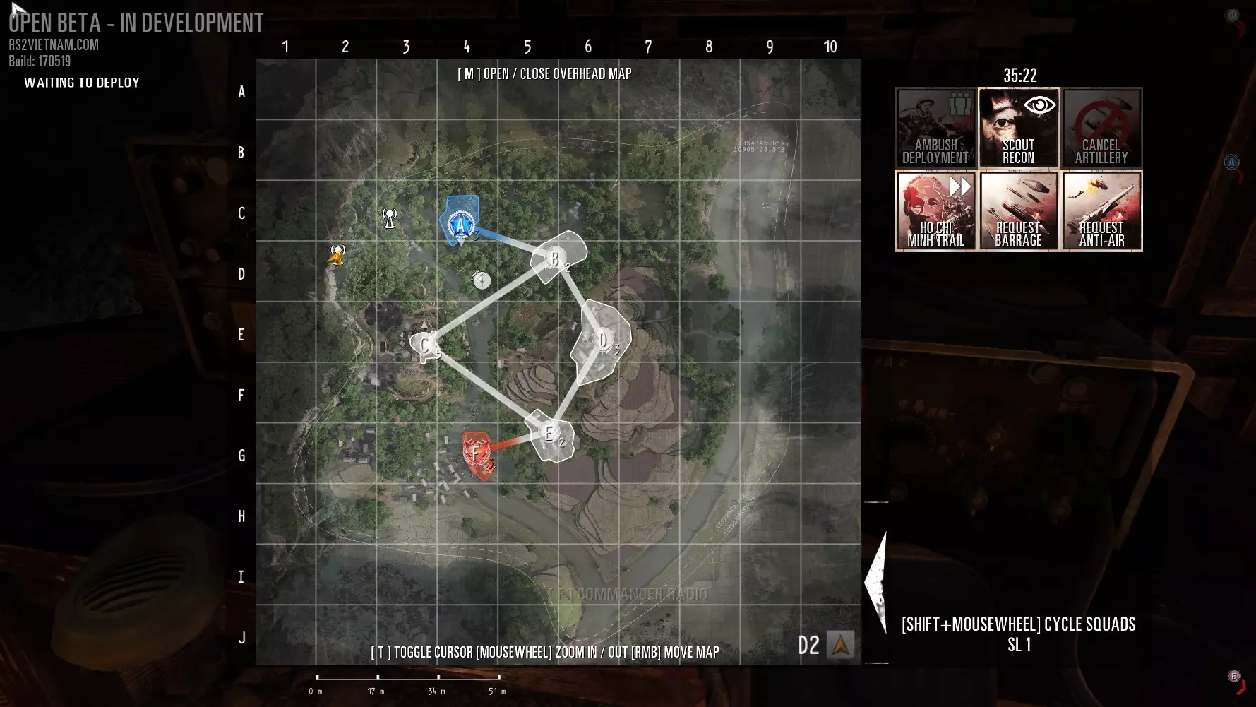 1. 伏击部署:清除指挥官附近队列中的所有人员。 2. 侦察兵侦察:侦察。与美军飞机不同,侦察兵无法被消灭,且敌方不会知晓侦察正在进行。 3. 取消炮击:取消 artillery 打击。 4. 胡志明小道:减少50%的支援点数消耗和冷却时间。定期使用此技能,战斗结束时你将拥有人数优势。 5. 请求弹幕:artillery。用所有可用口径进行打击。注意不要误伤友军。 6. 请求防空支援。呼叫防空导弹,可击落任何高度超过75米的目标。用于对抗直升机或CV-47运输机。导弹仅有一枚。实际为两枚导弹,第二枚会在数秒后发射。敌人可以通过将高度降至75米以下或驾驶直升机躲到障碍物后方(例如安老谷的山丘)来躲避导弹。武器: SKS 冲锋枪 手枪 烟雾弹 望远镜 3.0. 小队指挥官。 与《红色管弦乐队》系列前作不同,小队指挥官现在不再是独立职业。 小队用于玩家协作和简化指挥。 小队指挥官为其小队和团队履行重要职能。他可以向自己的小队下达命令。 1) 小队指挥官拥有望远镜,可以像指挥官一样设置标记。帮助你的队长标记敌方位置。美军小队队长可以投掷彩色烟雾弹进行临时标记。 2) 重生。美军小队队长是队员的重生点。不要贸然送死,记住小队中每名阵亡的士兵可在15秒后在你附近重生。越南军队小队队长随身携带工兵铲。使用工兵铲可以部署一个小队隧道。你的小队士兵将在这个隧道附近重生。隧道不能放置在据点附近,也不能靠近另一个隧道。