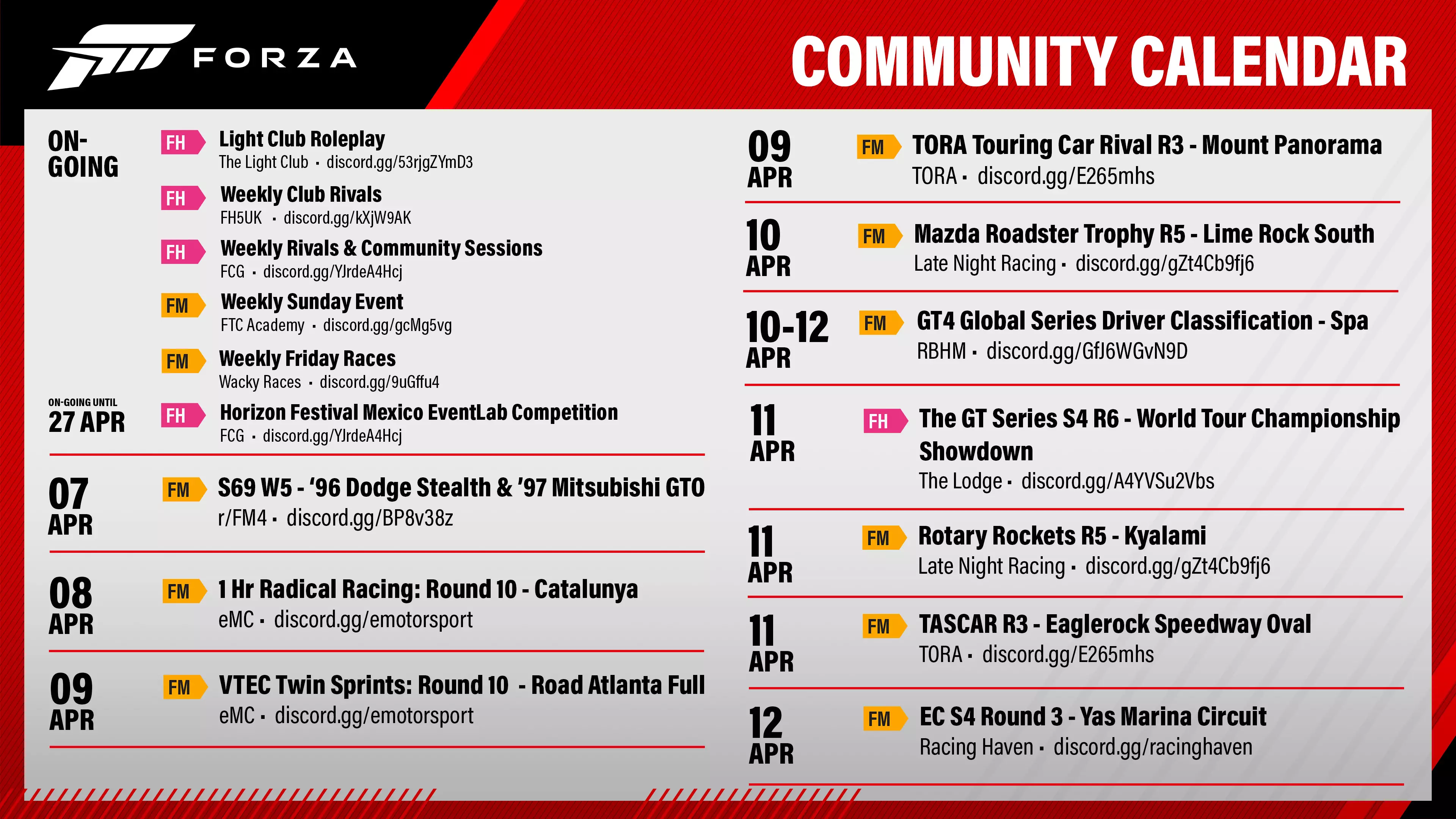 希望你已准备好迎接新一周的社区活动!以下是截至4月12日的活动安排。留意这些服务器上更多的比赛和多人游戏会话。 欢迎下周回来参与更多精选活动! 进行中 - 光明俱乐部角色扮演 - 光明俱乐部 进行中 - 每周俱乐部对抗赛 - FH5UK 进行中 - 每周对抗赛及社区会话 - FCG 进行中 - 地平线墨西哥嘉年华EventLab竞赛 - FCG 4月11日 - GT系列赛第四季第六轮 - 世界巡回锦标赛对决 - 会所