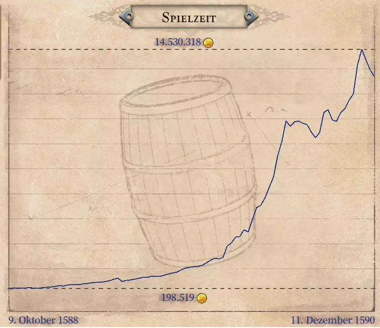 游戏期间的财富变化:在初始扩张阶段,财富增长迅速。到第一个转折点时,战争爆发,军费开支开始拖慢增长。之后我可以通过俘获并出售大量船只,使财富再次回升。在顶峰时期,和平降临。突然间,我拥有了太多军用船只,根本来不及全部送到造船厂出售。