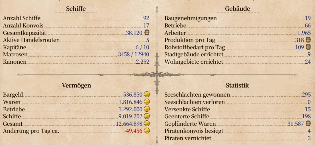 不同船只的贸易能力差异极大。这里有一个不同船只的单位时间载货量指数,其计算方式为载货量×速度÷成本。通过这个指数可以清晰看出哪些船只能够带来收益。 荷兰人那里有时可以买到贸易船队,尽管价格高昂,但总是物有所值。 使用TAB键可以在船队列表中切换,按Enter键可以打开船队最后到达的城市界面。此外,将重要船队通过STR+1至0设置到快速栏会非常有帮助。 5. 家乡城市的扩建 在每个战役中,扩建的目标是在你的家乡城市建造大型造船厂,这需要6000名居民。有时在居民达到8000人时,还需要建造大教堂。在教堂和酒馆的影响范围内建造所有住宅非常重要,这样才能确保每个住宅都能容纳240名居民。要始终保持100%的居住空间利用率,需要26栋住宅×240人=6240人,以及34栋住宅×240人=8160人。因此,在建造任何建筑之前,制定一个关于如何放置酒馆和教堂的计划,以便能够用住宅将它们包围起来。对于生产建筑,必须充分发挥其加成效果。例如,在建造棉花田之前,要考虑织布厂必须建在哪里才能获得住宅的加成,同时将棉花田设置在离住宅足够远的地方,但要确保之后可以增建织布厂。在住宅和原材料旁的手工业作坊可获得10%的生产加成,且成本固定,经济效益极高。因此,原材料应始终按4个一组进行布局。 4个裁缝铺紧邻住宅,前面设置4个织布厂,再前面是4个棉花田,这是游戏中的制胜组合。 对于木材、铁、煤和石头,最好将它们布局成O形,以便在中间放置一个工具制造商。 6. 船长 当处于战争状态时,例如在英国战役中,如果操作得当,这便是赚钱的许可证;若操作失误,则会比想象中更快破产。为此,你需要合适的船长。 即使对贸易船只的劫掠成功率很高,也很少能覆盖军事护航队的成本。因此,有必要找到军事护航队并将其攻占,最终出售这些战舰。 在接舷战中,拥有领导力、神射手和木匠技能的船长最为宝贵。 凭借领导力可以携带更多海军陆战队,神射手能通过暴击更快射杀敌方海军陆战队,木匠则会在战斗结束时部分修复己方战舰,使其为下一次攻击做好更充分的准备。 敏捷和机动性相对不太重要。 拥有导航员、舵手和水手技能的船长更有助于贸易护航队,他们能增加载货量并提高航行速度。 可以找到一些教官,他们能以少量费用培训船长。一旦找到这样的教官,必须立即暂停所有事务,让每个至少拥有3点剩余点数的船长立即前往那里。这些教官只会停留几天,是游戏中最值得的投资。 7. 利用巡逻模式 - (技巧) 指挥军事船只需要船长具备一定数量的指挥点数。 初始船长的指挥点数为2、4、6或8点。 检查是否拥有足够指挥点数的操作在船只离港和激活巡逻模式时进行。若巡逻模式保持激活状态,则不会再检查船长是否满足要求。 因此,应在每场战斗前切换到该模式。所有被缴获的船只都不会计入(指挥点数限制),并且还能自动寻找后续战斗。这样一来,你可以进一步掠夺更多船只,还能征服最多包含10艘战舰的额外军事护航队。这些额外的船只会一同参与战斗。 因此,只要你位置选择得当,并准确掌握出发时间,就能成功劫持每一支 treasure fleet。一支这样的舰队拥有3200件货物和4艘战争大帆船,能带来超过100万的货物收益以及可出售的船只。 你也可以手动操作这一切,但需要先选中护航队并进行手动控制。 8. 进行海战 - 舰队中最强大的船只……是护卫舰。 如果船长和船只搭配得当,并且通过完成任务解锁了战术,玩家就能用自己的舰队击败任何敌对舰队。由于我们的目标是登船,所以只使用散弹。 我的舰队组合建议如下: 4点指挥值:1艘大型舰、1艘中型舰、1艘护卫舰 6点指挥值:1艘大型舰、3艘中型舰、1艘护卫舰 8点指挥值:2艘大型舰、3艘中型舰、1艘护卫舰 每支舰队都必须配备1艘小型护卫舰,否则就不必出海了。 大型舰凭借其强大的战术【装填】,总共可以进行4次侧舷齐射,甚至能在第1回合就将2艘敌方大型战舰的船员数量削减至可登船水平。 为此,1艘中型舰应具备【推进】功能,以便将敌人推至合适的侧舷齐射位置。此外,第1回合使用【火箭】还能让第3艘敌方战舰失去战斗力。配备加农炮的西班牙大帆船只有在别无选择的情况下才勉强有用。受损的船只会减少收益。护卫舰体型太小,几乎没什么用处。 战术方面还有以下建议: 1. 可以通过点击选择自己的现役船只。 2. 开局使用大型船只,推进、装填弹药并发射火箭。 3. 首先登船攻击敌方护卫舰。敌方若未装填弹药,也会损失2轮侧舷齐射机会! 4. 大型船只负责炮击,小型船只负责登船。许多玩家把这弄反了,导致强大的船只被无效地封锁3个回合,而它们本应能有效歼灭敌方船员。小型船只数量充足,就算被击沉也无妨。 5.不要同时进行过多的劫掠行动——有时最好还是让船只保持活跃状态。 9. 结果——乐趣与成功 在所有这类游戏中,我更喜欢使用“走走停停”的速度模式。和平时期我会将速度调至5倍,战争时期调至3倍,并且在每次响起提示音时按暂停键。 有了这些提示,我认为你几乎不会再有任何问题去掌控战役了。 尤其是英国战役,这样玩会成为一次很棒的成功体验。 这是我的最终统计数据: