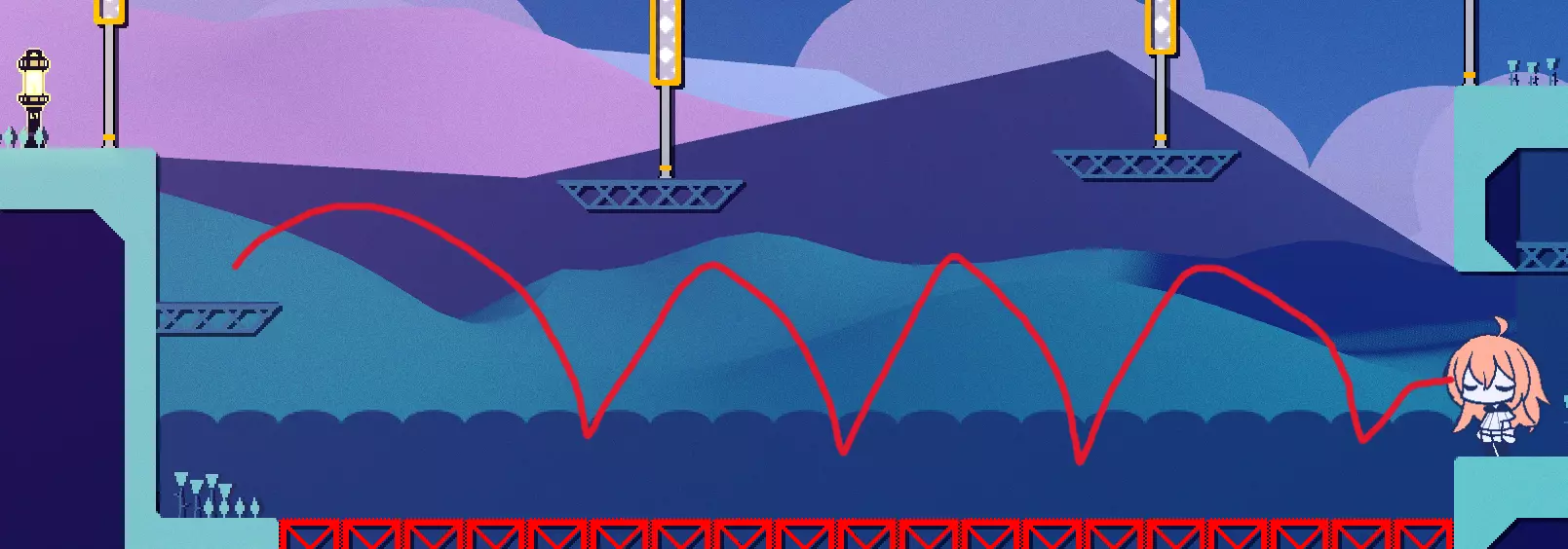 经过第4个灯笼后,你可以穿过一个无伤害的小缺口,那里没有方块,下方是一排均匀分布的方块。接近终点时,如果你掉下去,会落在悬崖峭壁区域的岛屿上。