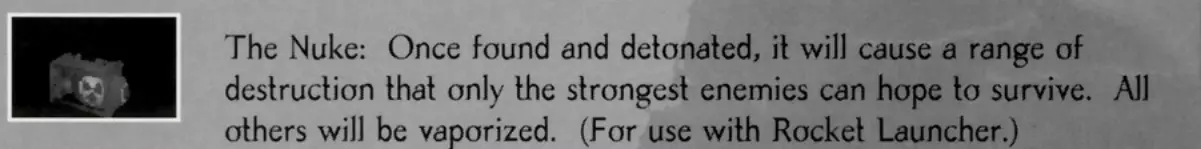 核弹:找到并引爆后,它会造成巨大破坏,只有最强的敌人才能指望存活下来。其他所有敌人都将被蒸发。(用于火箭筒)