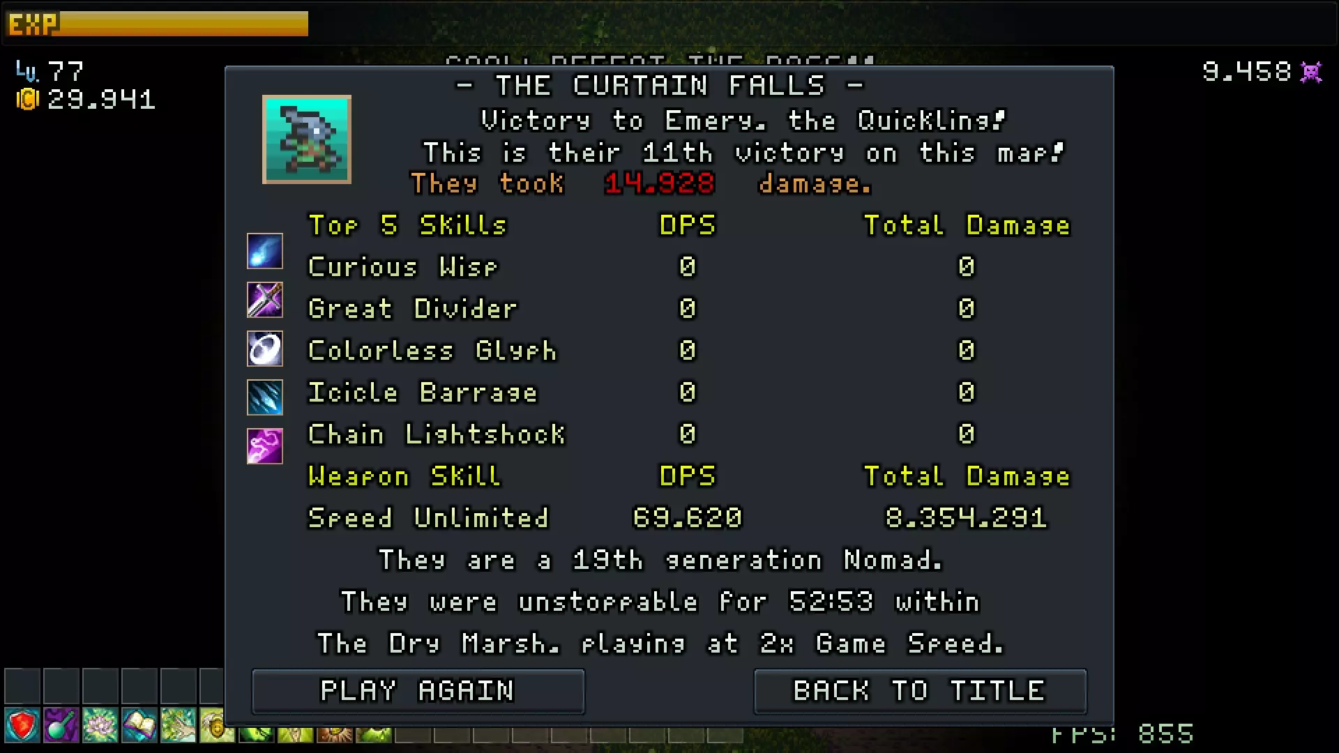我建议你们先玩第一张地图,因为那里有很大的空间可以躲避最终Boss,这很有必要,否则游戏进程会结束得太快。 我玩的是【快行者】角色,选择了【游牧】专精,这样能更快获得增加经验值的被动技能。 实际上你们可以一直站着不动,因为没有敌人能对你们造成严重伤害。升级时不要选择武器,因为武器可能会导致Boss过早死亡。最好只选择那些能让生存更轻松的物品。当最终Boss出现时,只需在地图上不断从一个角落移动到另一个角落,这样Boss就不会攻击你。你可以正常继续击败敌人,不会导致本局游戏结束,直到达到77级。