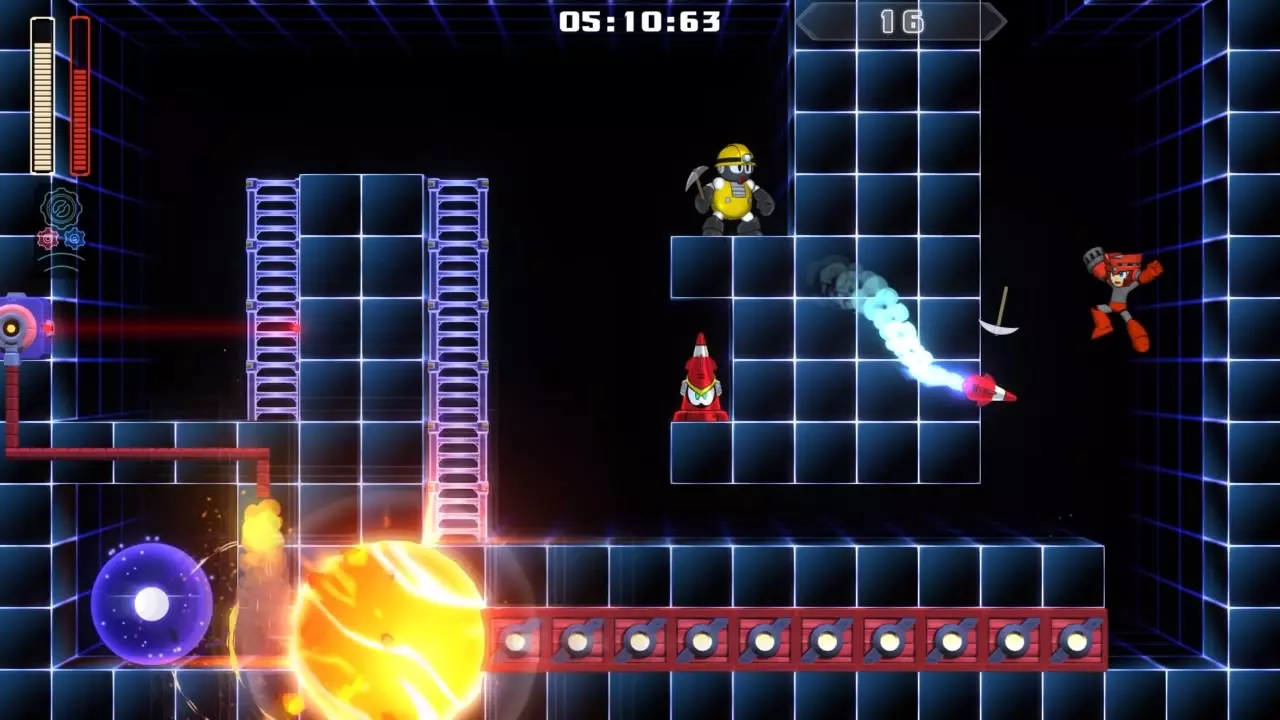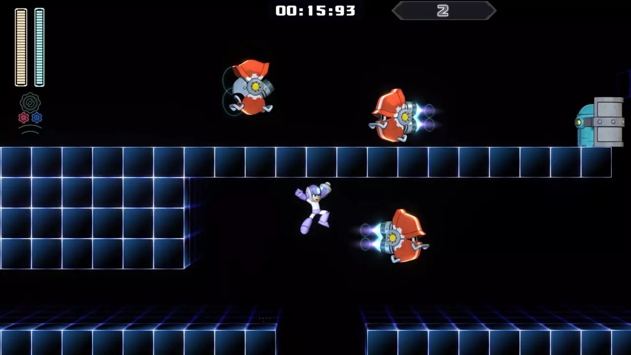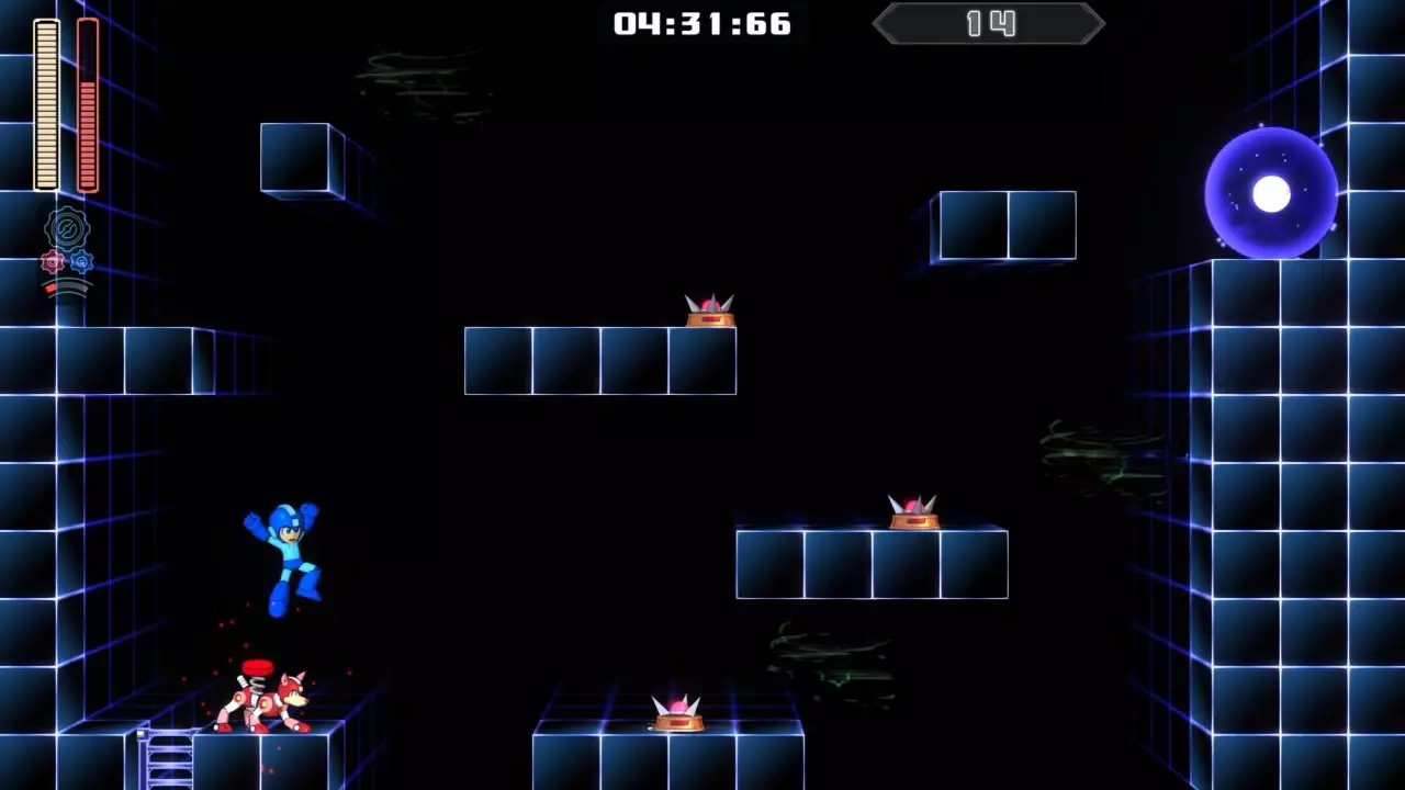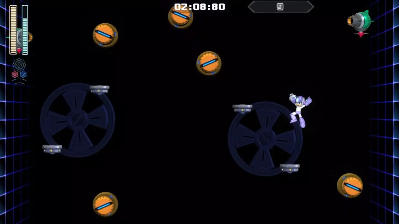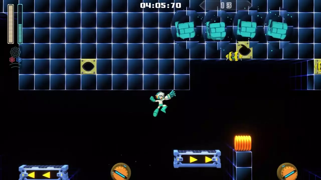 14号房间 目标:抵达传送器 策略:使用最终蓄力射击(在使用动力齿轮时蓄力buster,直到能量条接近充满并播放音效,然后发射)消灭第一个加比欧。消灭空中石并瘫痪另一个加比欧。在第二部分,使用冲刺弹簧跳至顶部,然后消灭空中石并瘫痪加比欧,以便你能跳至传送门。缓慢通过这个房间,不要使用特殊武器,这里不需要它们。
