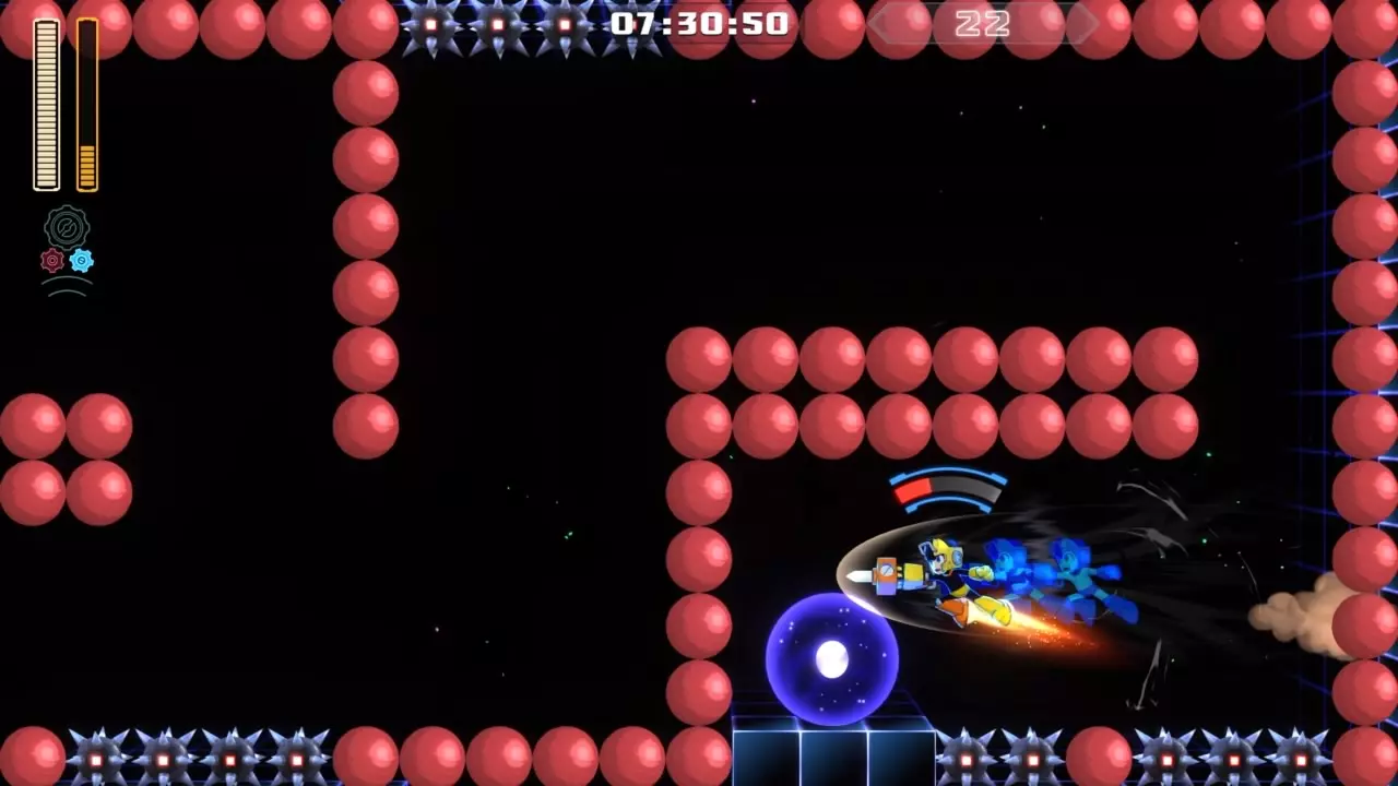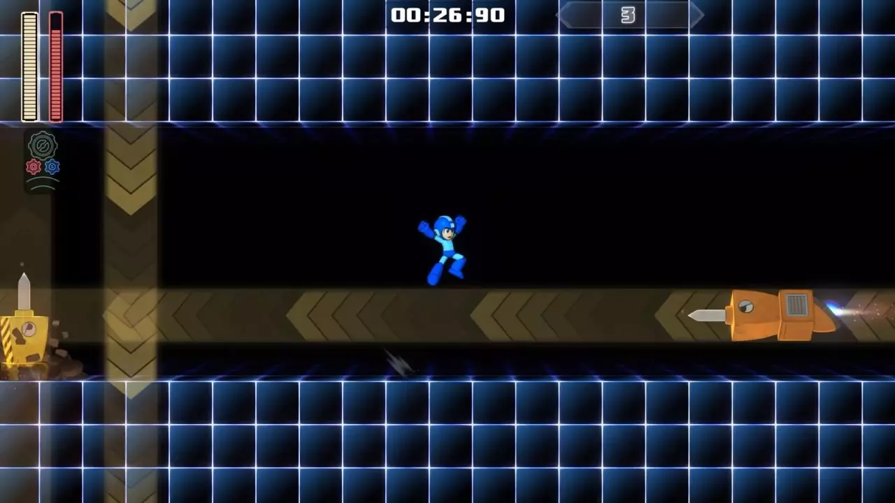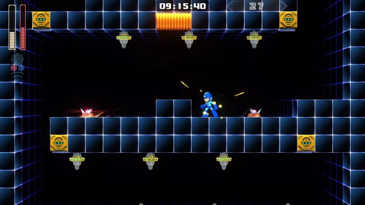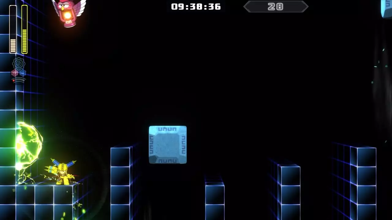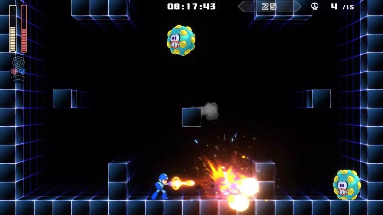 14号房间 目标:抵达传送器 策略:使用最终蓄力射击(在使用动力齿轮时蓄力buster,直到能量条接近充满并播放音效,然后发射)消灭第一个加比欧。消灭空中石并瘫痪另一个加比欧。在第二部分,使用冲刺弹簧跳至顶部,然后消灭空中石并瘫痪加比欧,以便你能跳至传送门。缓慢通过这个房间,不要使用特殊武器,这里不需要它们。