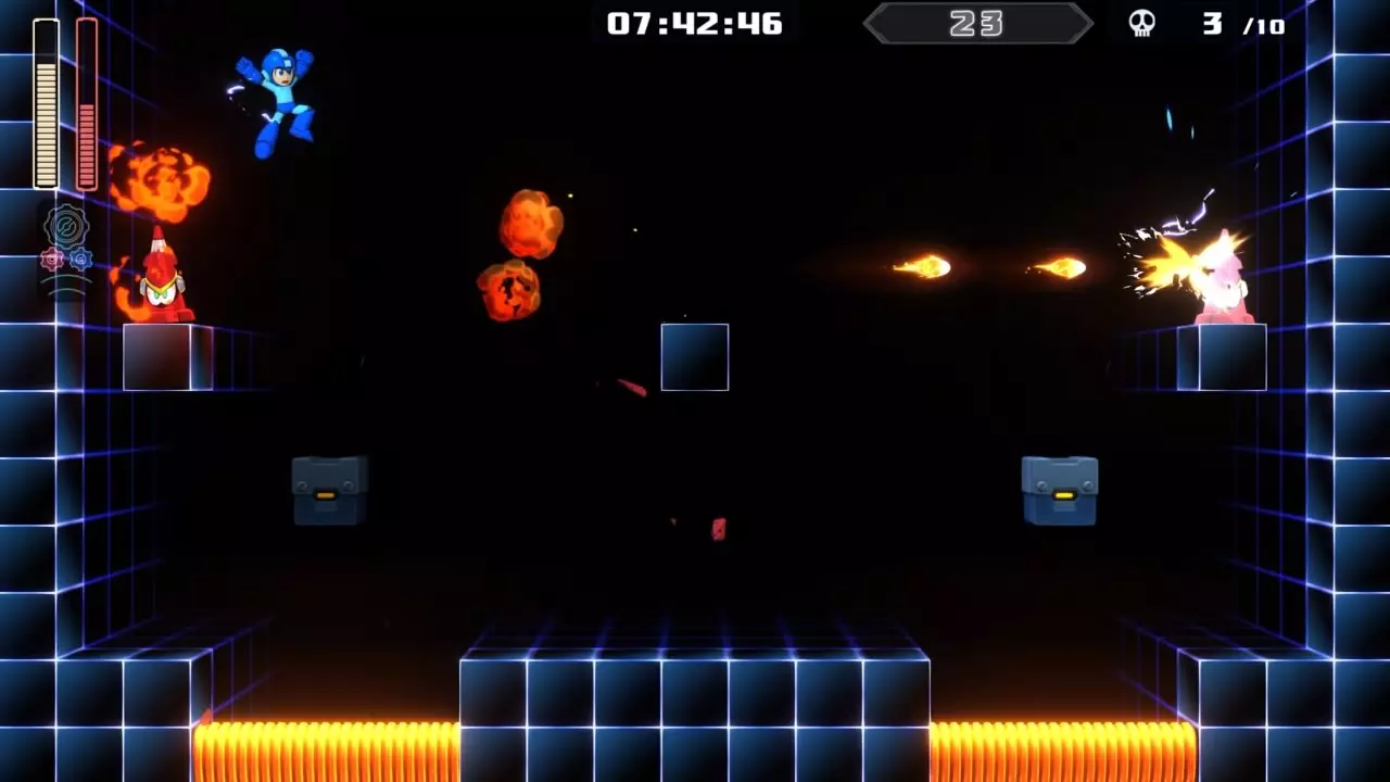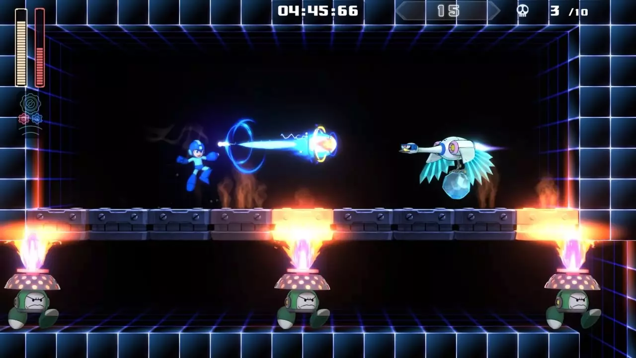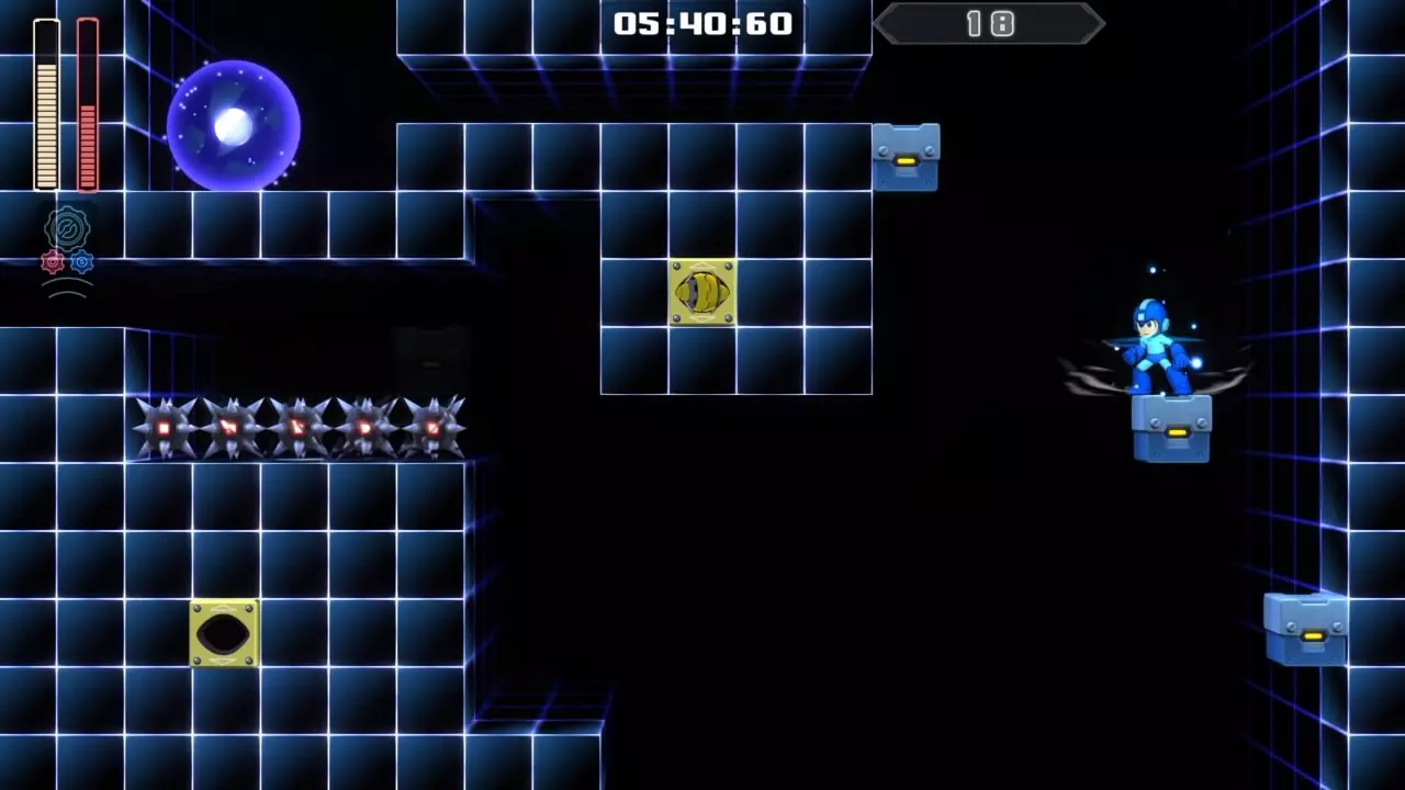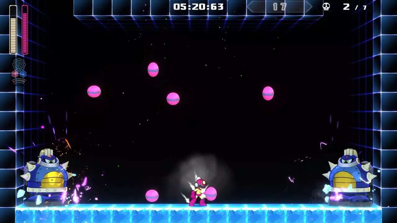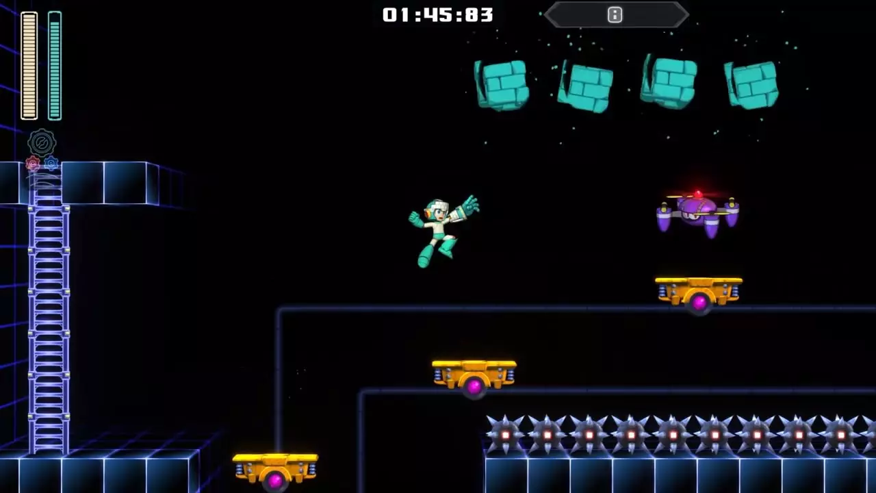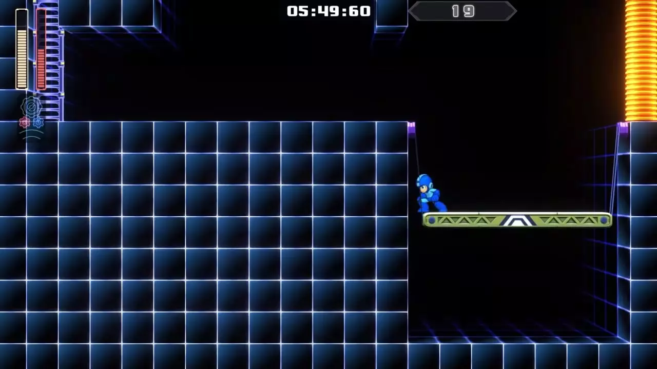 14号房间 目标:抵达传送器 策略:使用最终蓄力射击(在使用动力齿轮时蓄力buster,直到能量条接近充满并播放音效,然后发射)消灭第一个加比欧。消灭空中石并瘫痪另一个加比欧。在第二部分,使用冲刺弹簧跳至顶部,然后消灭空中石并瘫痪加比欧,以便你能跳至传送门。缓慢通过这个房间,不要使用特殊武器,这里不需要它们。