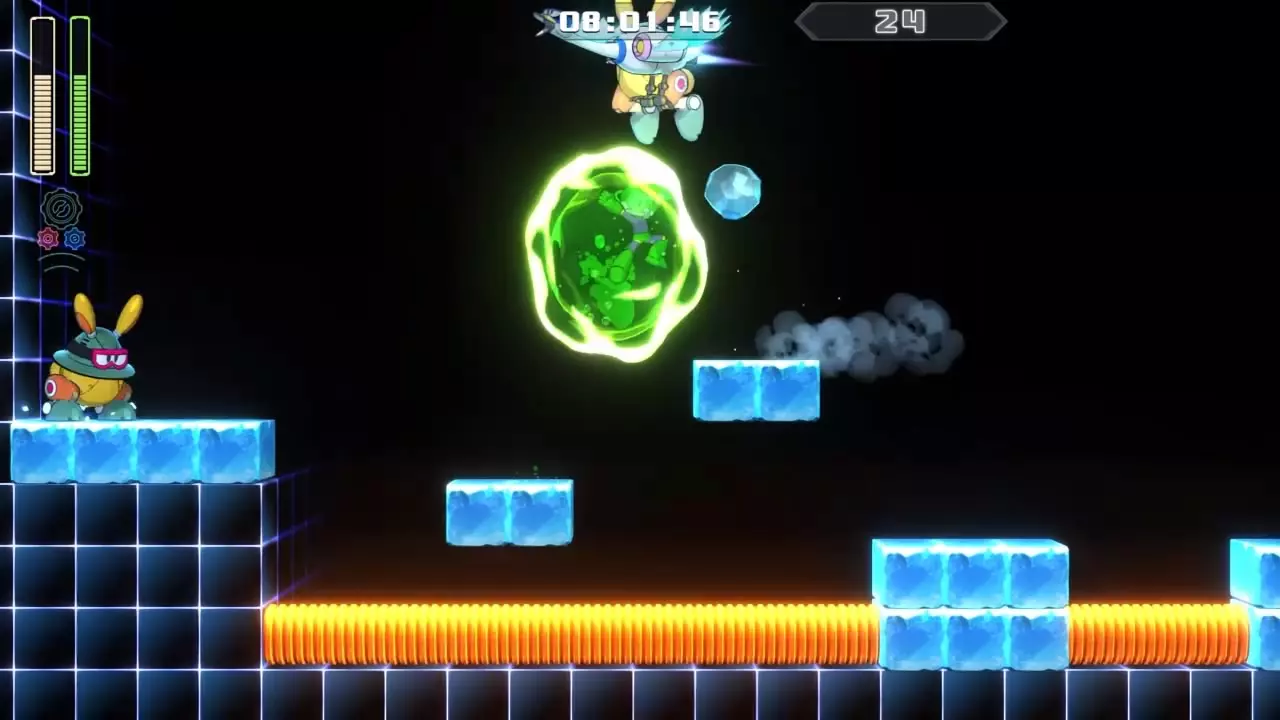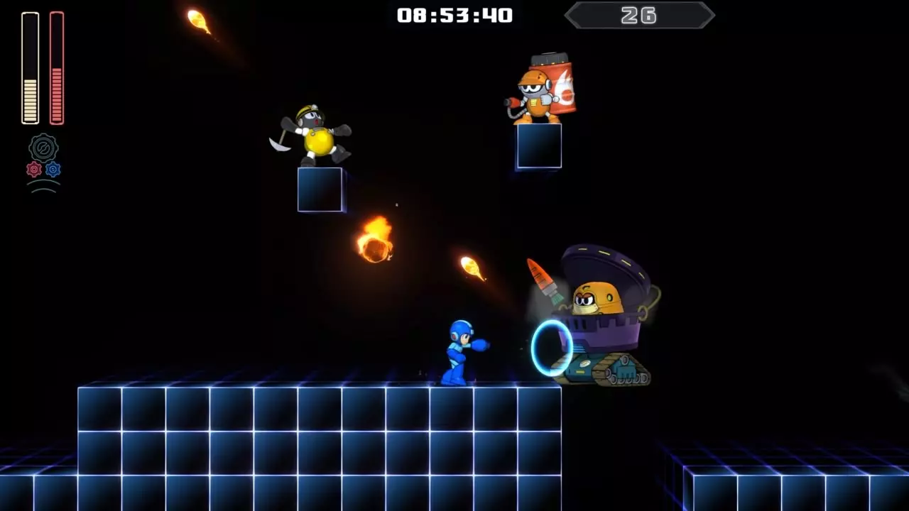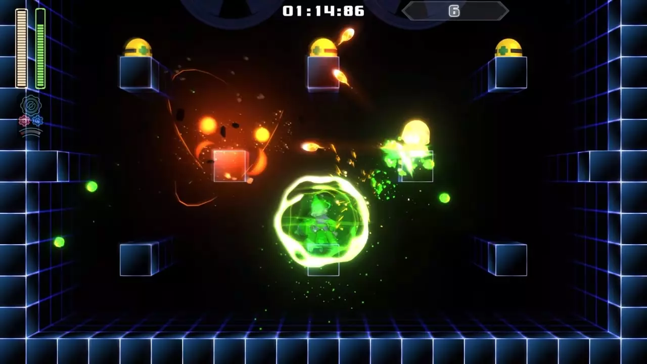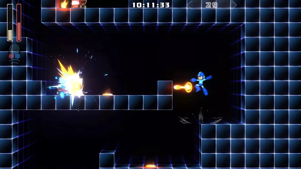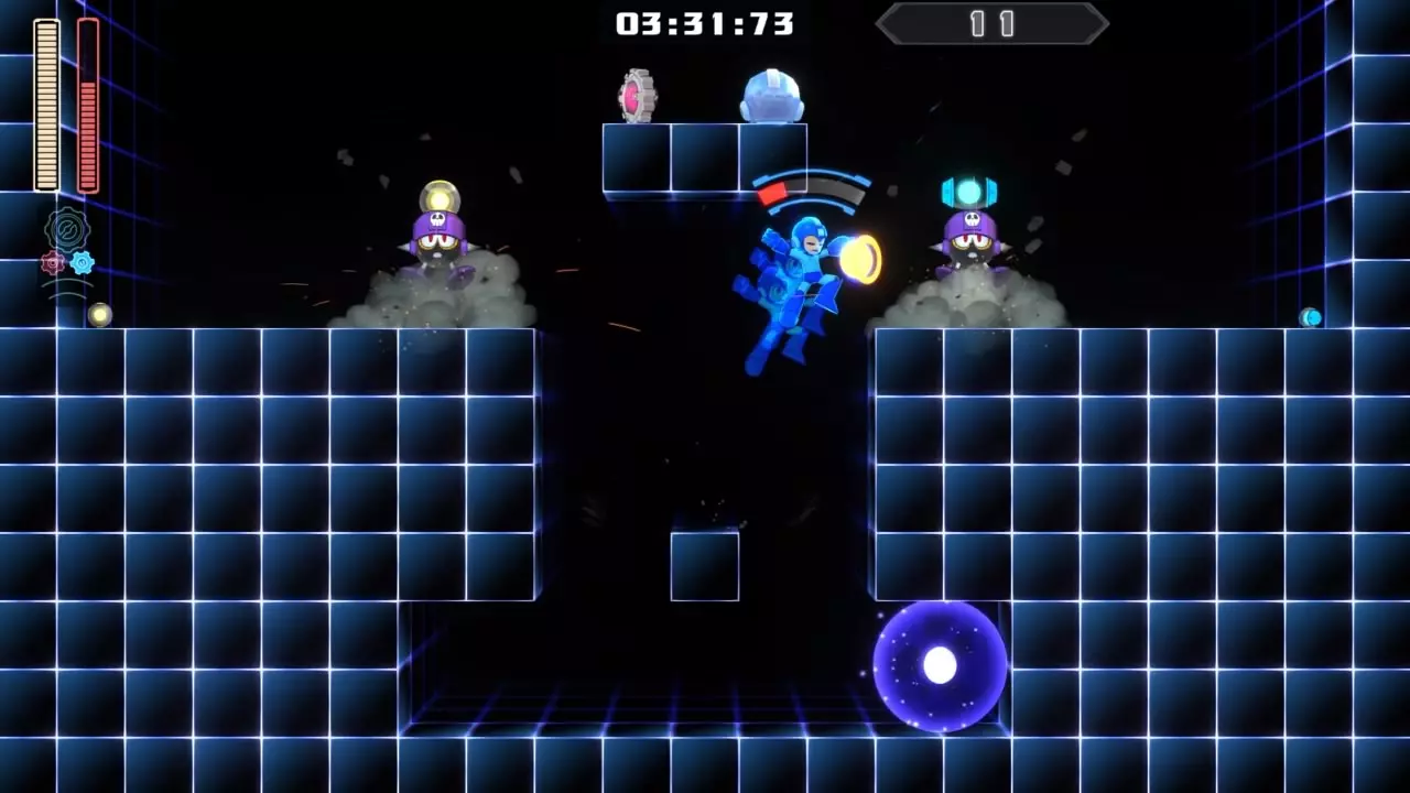 14号房间 目标:抵达传送器 策略:使用最终蓄力射击(在使用动力齿轮时蓄力buster,直到能量条接近充满并播放音效,然后发射)消灭第一个加比欧。消灭空中石并瘫痪另一个加比欧。在第二部分,使用冲刺弹簧跳至顶部,然后消灭空中石并瘫痪加比欧,以便你能跳至传送门。缓慢通过这个房间,不要使用特殊武器,这里不需要它们。
