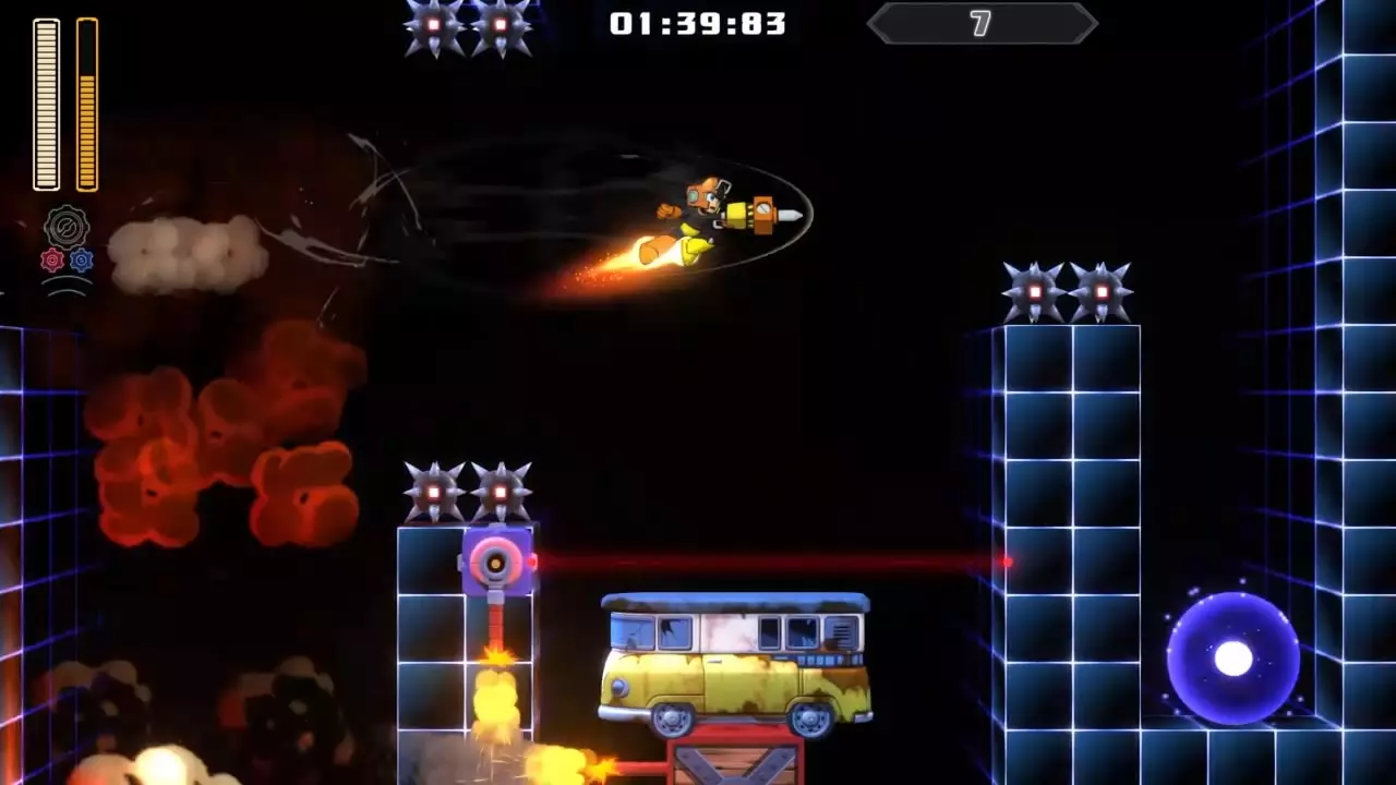 7号房间 目标:抵达传送器 策略:又一个棘手的房间。跳上第一辆小型货车,当爆炸将你向上弹起时,跳到下一辆并重复此操作。当你到达上下方都有尖刺的货车旁时,跳跃并使用【堆桩驱动器】来越过缺口。最后,使用【速度齿轮】并把握时机跳入传送门。