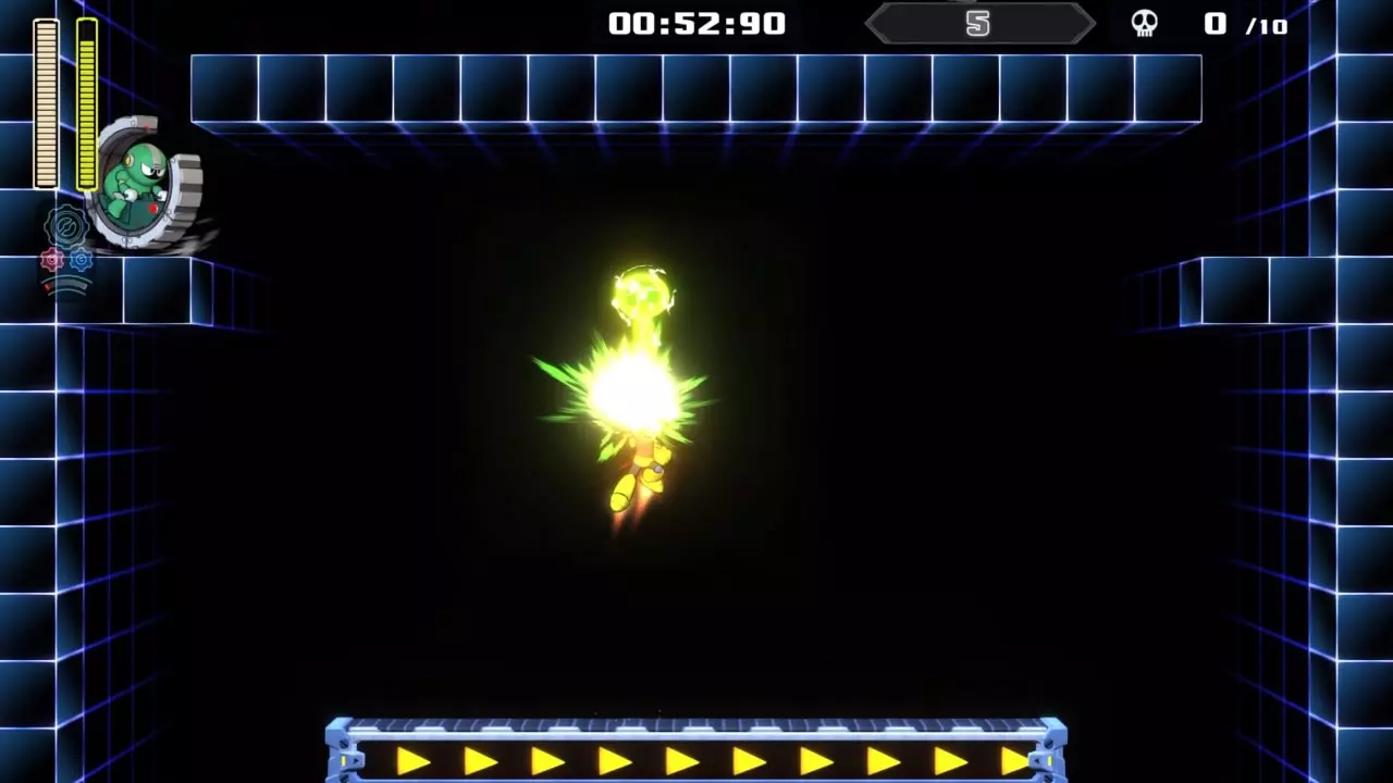 第九房间 目标:抵达传送器 策略:平台移动速度较快,但敌人数量较少。保持耐心并使用速度齿轮。当你遇到两组快速移动的平台时,启动速度齿轮并跳至更高的一组平台,在从右侧跳上传送器之前,先从其下方通过,以避免碰到兔子气球。