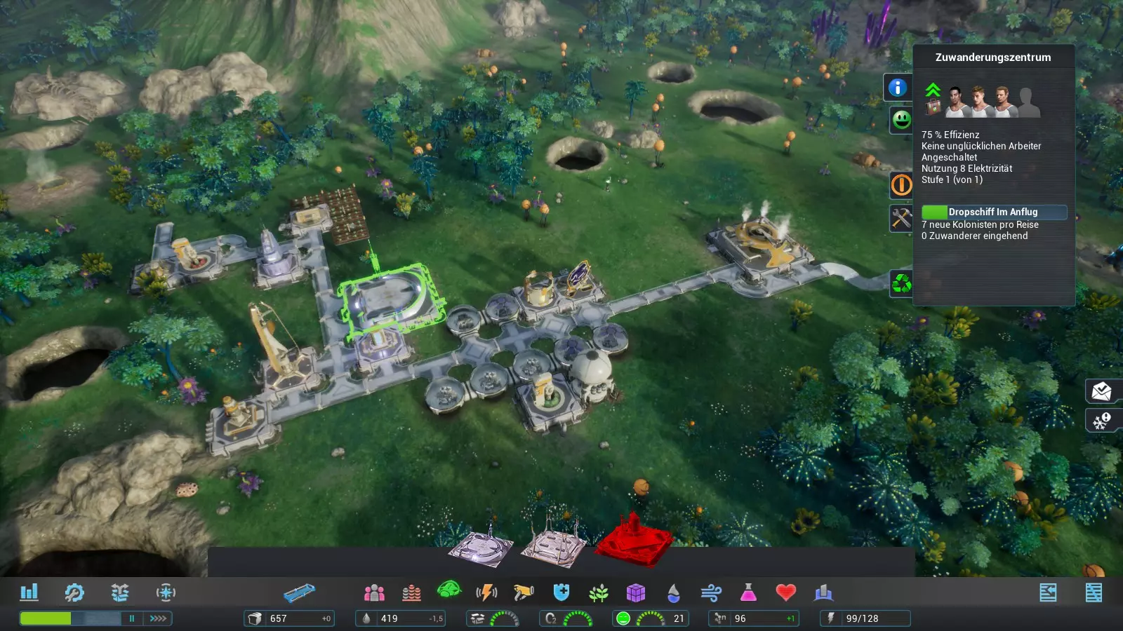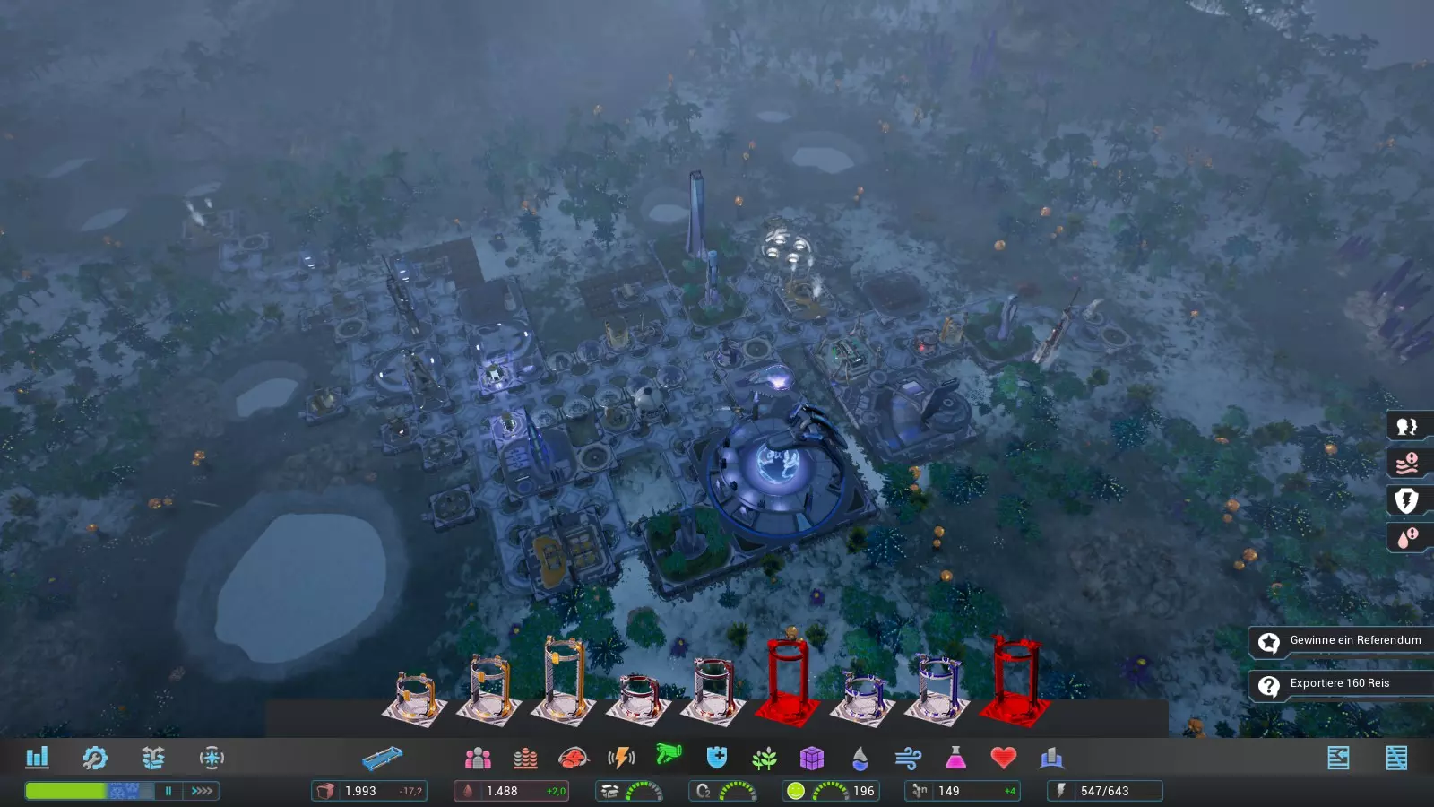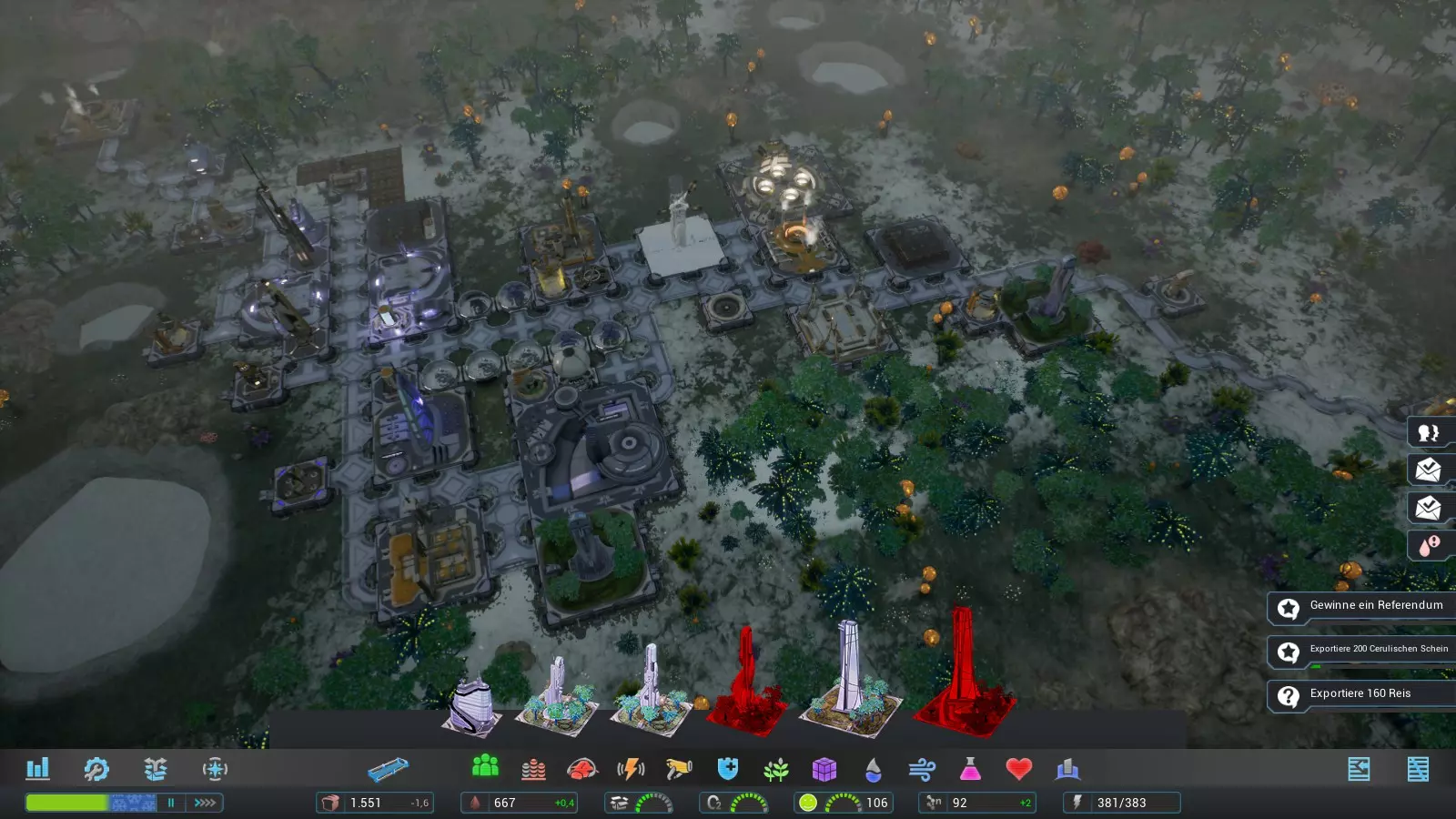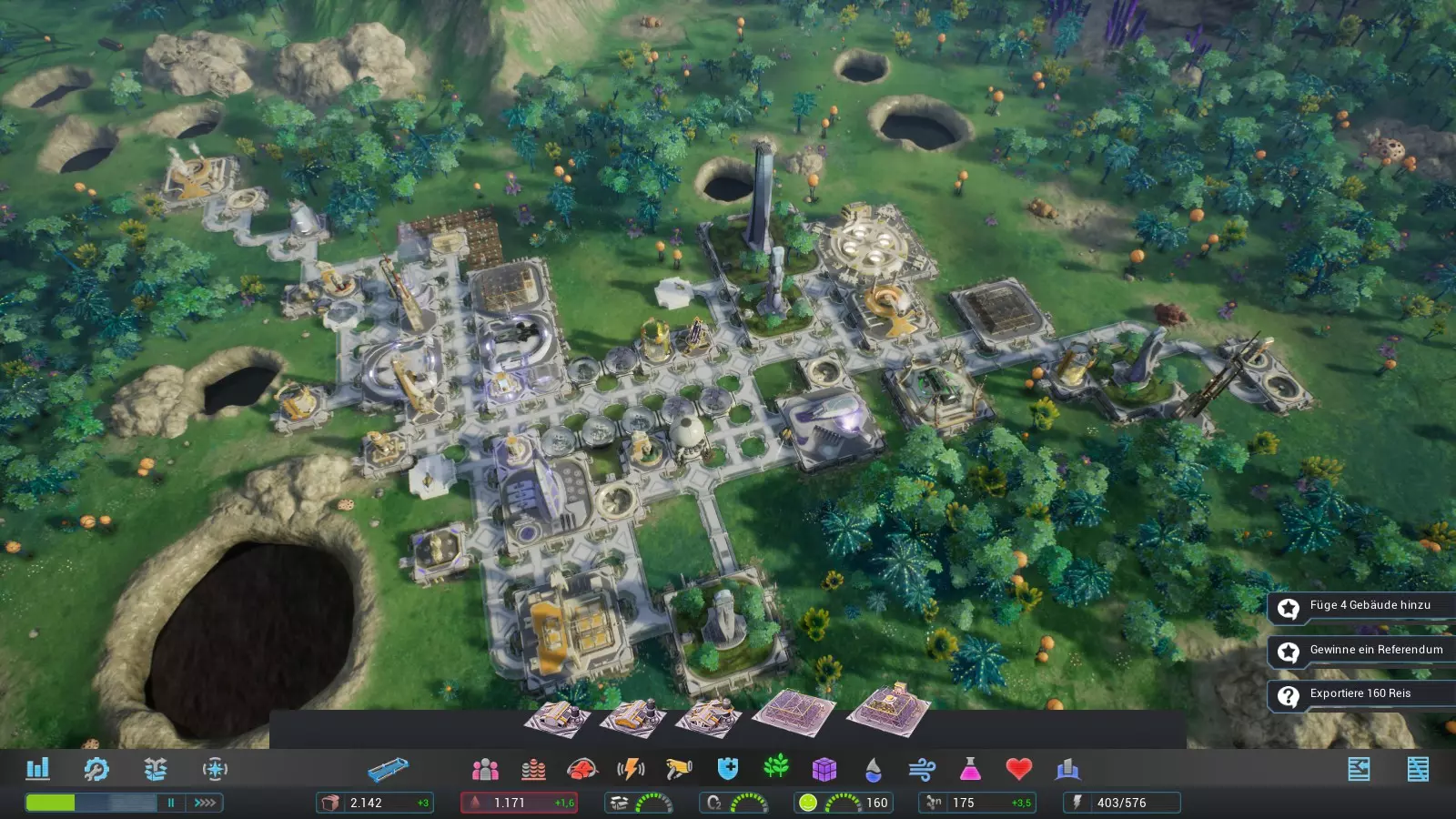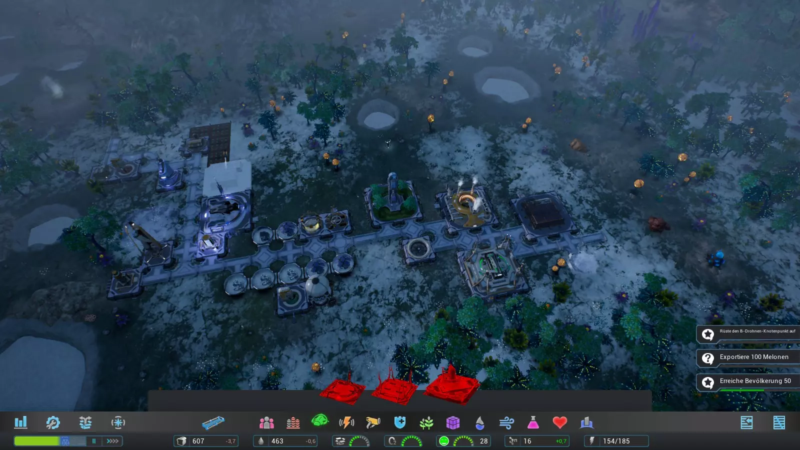 我建造了酒吧烧烤店、医院和佐里乌姆矿作为三个必要建筑,因为这些建筑反正未来也会需要,所以之后就不再列出了。基本上,这些建筑可以之后再建,因为它们目前不一定是必需的。 我们建造研究中心时,要确保尽可能多的无人机能够到达那里,以便尽快完工。我们可以增加无人机节点的工人数量来加快建造速度。在研究中心里,我们研究天蓝荧光。为了加快研究进度,我们将工人数量增加到最大。 我们利用研究的时间为殖民地的下一步行动做准备: