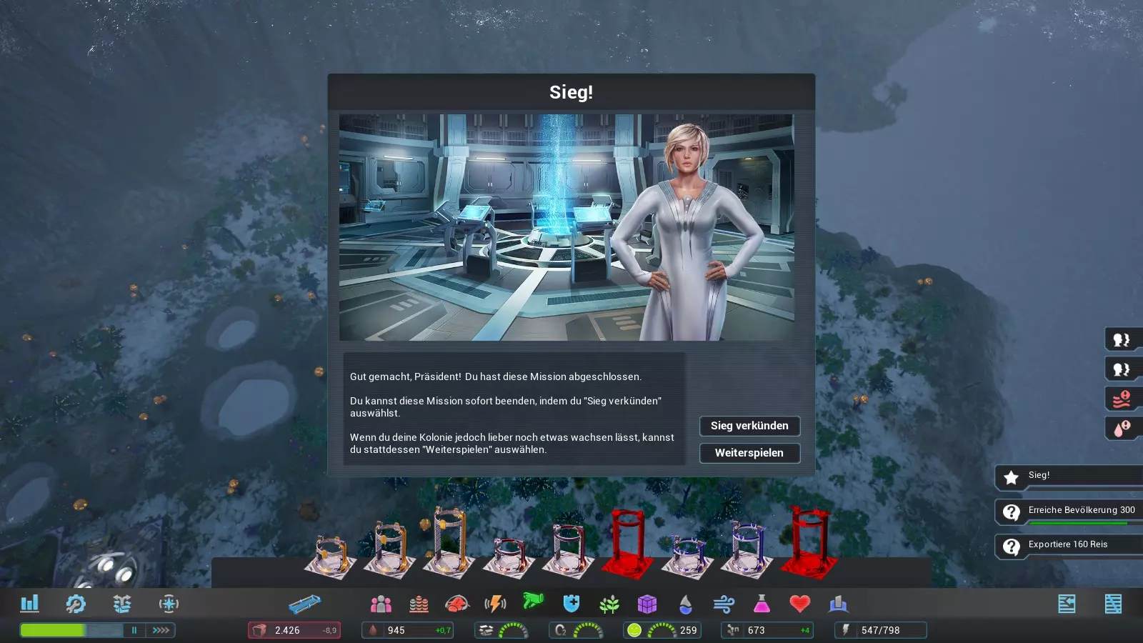 在第3太阳日结束的公投之后,我们终于可以完成任务了。由于除最终任务外的所有任务都已在第3太阳日完成,我们需要让地球历史中心正常运行一个太阳日。因为我们的殖民地物资供应充足,所以这项任务不成问题。理想情况下,我们会在第5太阳日开始时完成任务,并为获得的成就感到高兴。