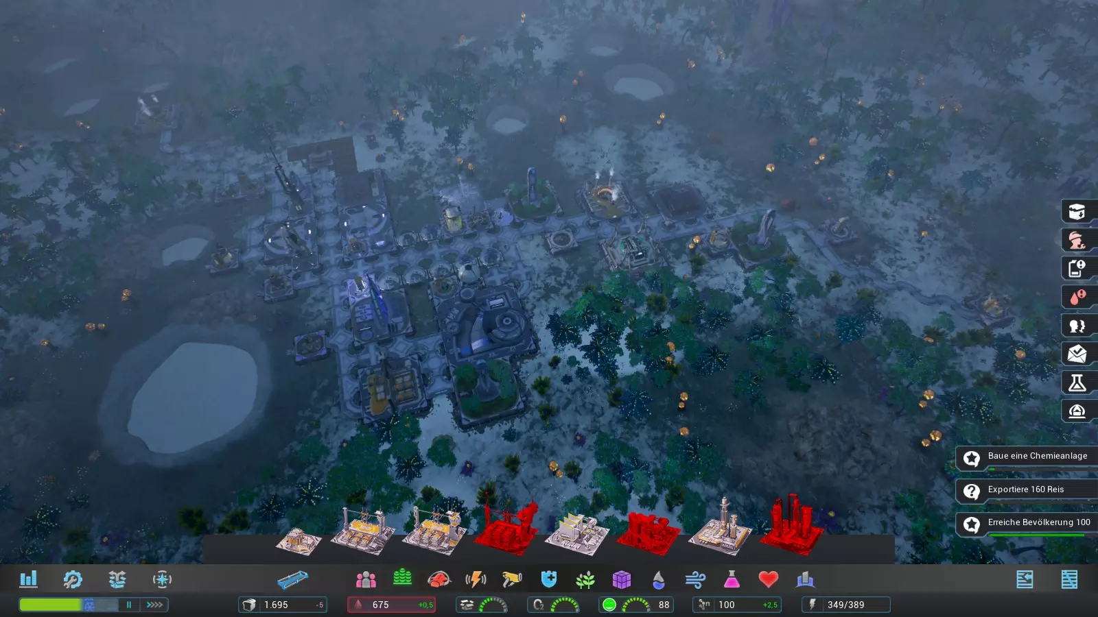 首先,我们遵循给定的任务目标: 建造水泵 建造农场 建造铜矿 建造地热发电机 建造公寓 建造纳米处理器 建造小型存储仓库 建造移民中心 建造栖息地 建造进气扇 建造贸易中心 (建造铁矿)