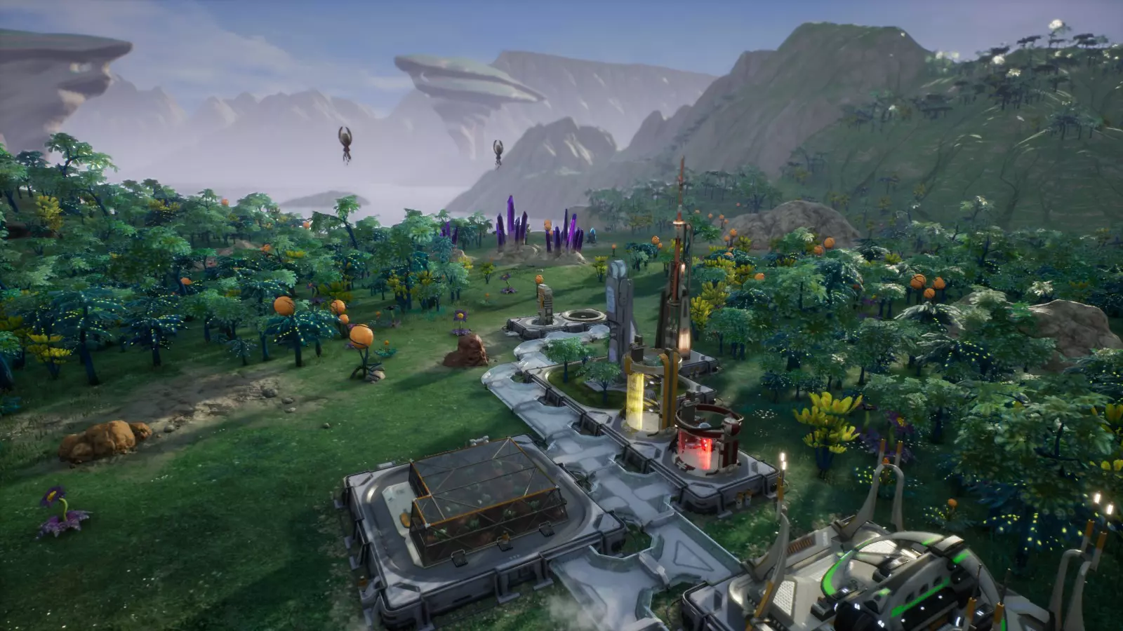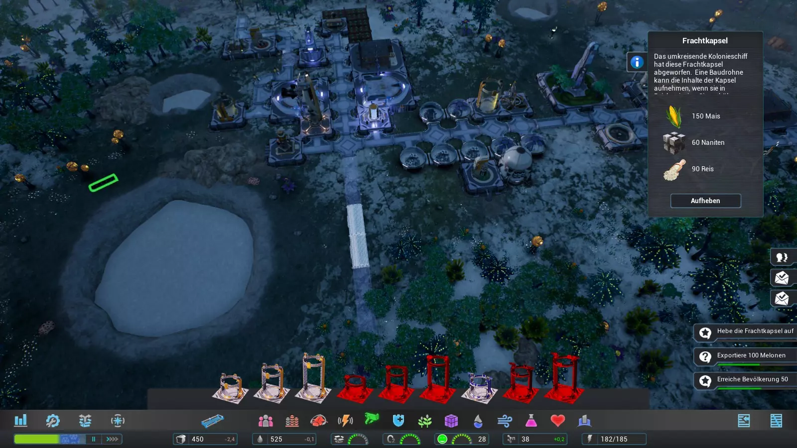 之后我们需要恩塔里和异星鼠尾草来生产天蓝辉光,这就是我们现在用两个温室来培育原材料的原因。相应地,一个温室种植恩塔里,另一个种植异星鼠尾草。在任务期间,我们要密切关注恩塔里和异星鼠尾草的库存,因为当两者各达到100单位时,我们会在温室中改种甜瓜以提高食物产量。 由于之后我们必须赢得一场公投才能推进主线任务,所以我们正在建造第二个移民中心,并让满编的工人在那里工作。公投的举行时间取决于我们何时达到一定数量的居民。因此,我们必须及时聚集足够的殖民者,确保公投在第3太阳日之后举行。如果再晚一点进行,我们就无法达成成就了。 我们建造的工程无人机既要能装载所需的货运舱,又要能抵达地热喷口(见图)。 一旦我们在第1太阳日完成了所有这些操作,第2太阳日的挑战难度依然不减。不过按照这个进度,我们很容易就能获得成就。 第2太阳日 在第2太阳日,我们继续按照之前太阳日的做法进行: