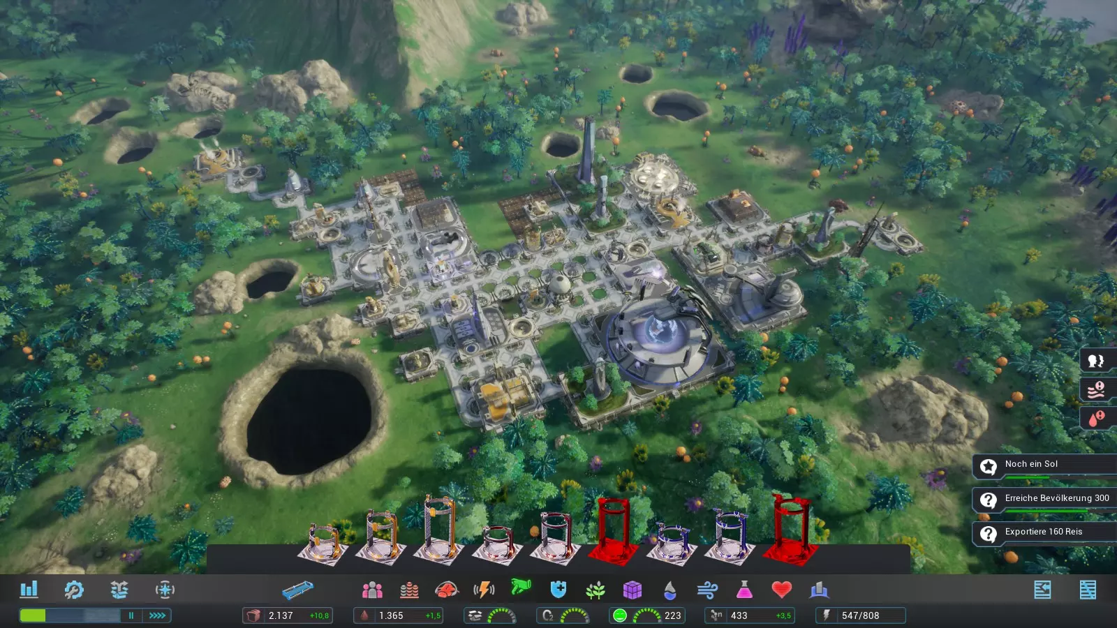 (升级铜矿) (建造地热发电机) (建造纳米处理器) (建造化工厂) (升级铁矿) (升级公寓) (建造佐里乌姆发电机) 生产200单位天蓝之光 (建造栖息地) 出口200单位天蓝之光 (升级水泵) 我们通过升级现有建筑和建造新建筑来扩大能源和纳米机器人的生产。一旦天蓝之光研究完成,我们就在化工厂中生产200单位的天蓝之光。由于我们在第1太阳日已经储备了足够的恩塔里和异星鼠尾草,因此能够轻松生产天蓝之光。之后,我们增加贸易中心的工人数量并出口天蓝之光。我们可以拆除化工厂,但之后会需要研究中心。如果所有这些都能在第2太阳日完成,我们的进度就非常理想了。 第3太阳日 在第3太阳日,我们将完成任务的最后目标。凭借我们庞大且繁荣的殖民地,这不成问题。