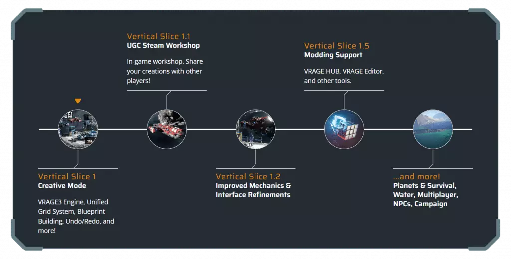 垂直切片1:创意模式 现在您可以体验VS1:创意模式,这是我们的首个垂直切片版本,其中包含: 【新的统一网格系统(25厘米)】(不再有小型和大型网格之分!)《太空工程师2》更新内容: 1. 新的蓝图构建功能:包括网格吸附、部分复制/粘贴、工具栏分配 2. 网格撤销/补充功能 3. 改进的创意模式,配备强大的建造工具:新的体素手、对称工具、线条/平面建造工具以及绘图工具 4. 网格移动速度提升至约300米/秒 5. 安全速度系统,可防止速度低于20米/秒时的损坏 6. 新增带相机稳定功能的磁性靴,新的物理效果以及动态断裂和碎片系统,实现更逼真的破坏效果。通过光线追踪、全局光照、细分地形、视差效果、平滑装甲边缘和改进的照明系统带来视觉革新。全新的VRAGE3引擎提供更高的性能,并为未来优化提供潜力。未来几个月将发布额外的垂直内容片段,每个都将扩展游戏的功能和内容。这一开发过程将持续未来几年,直至我们实现对《太空工程师2》的完整设想。您可以在详细更新日志中查看所有变更。