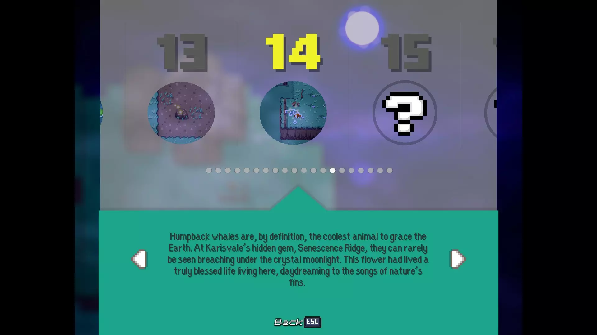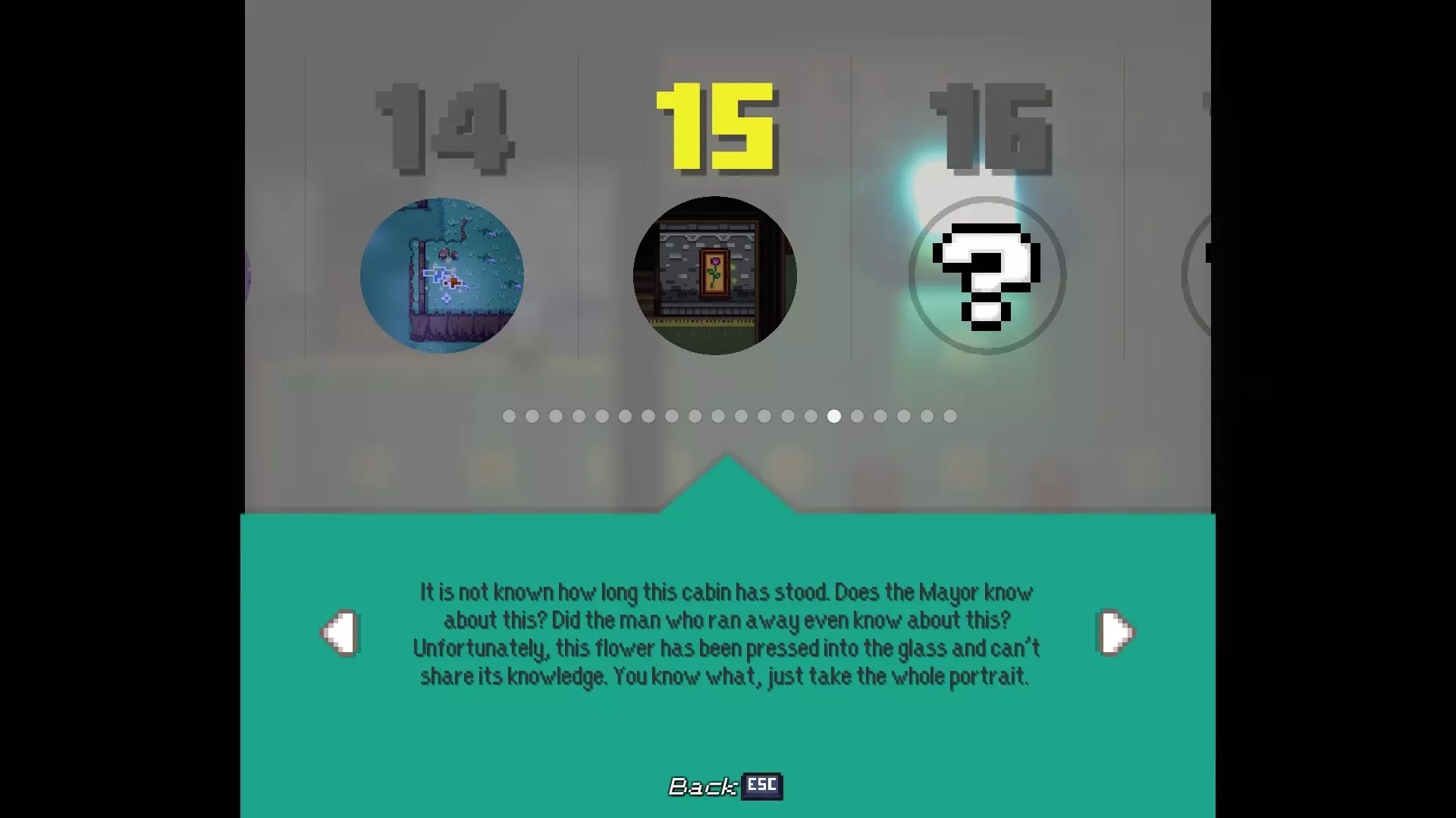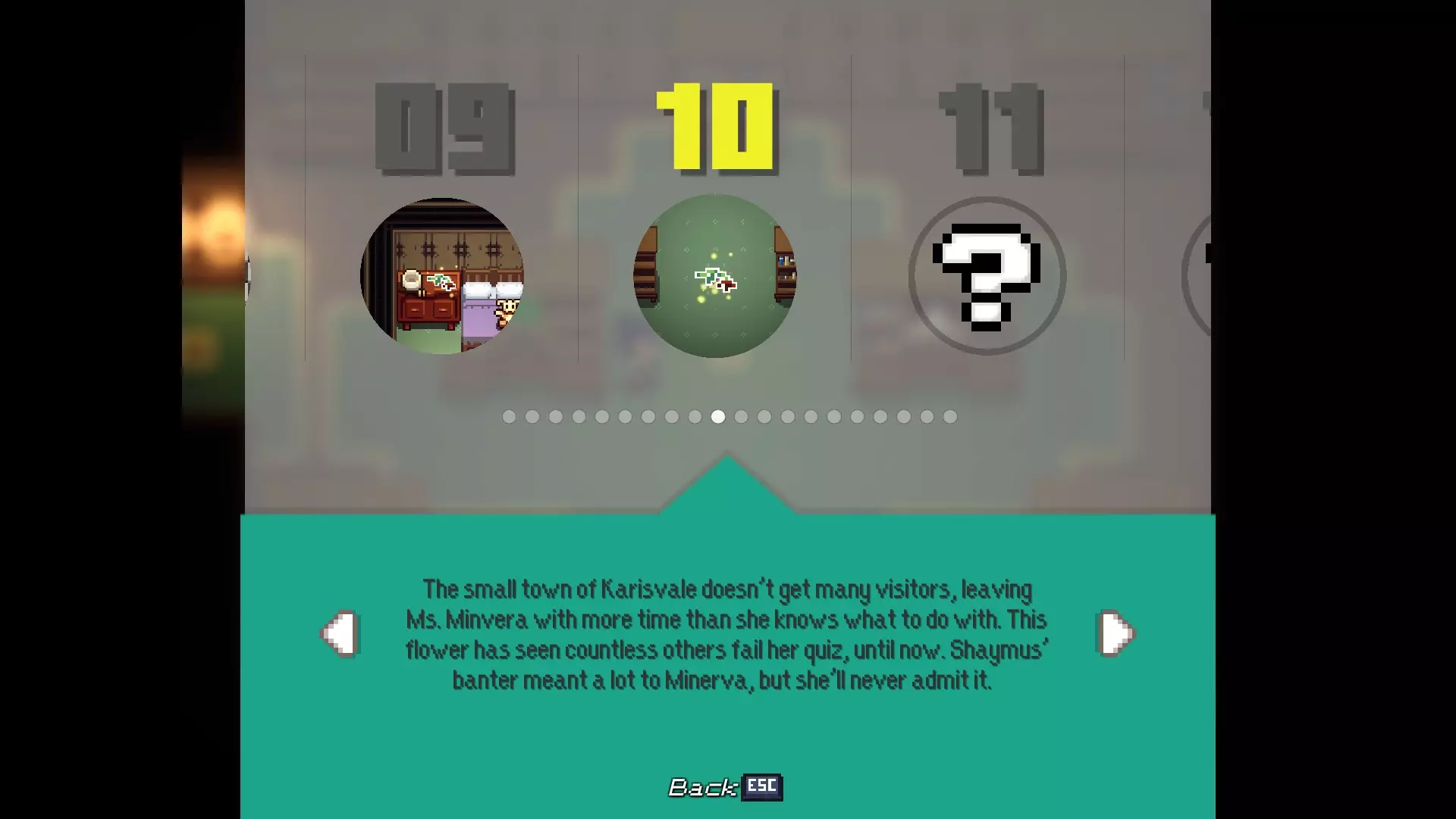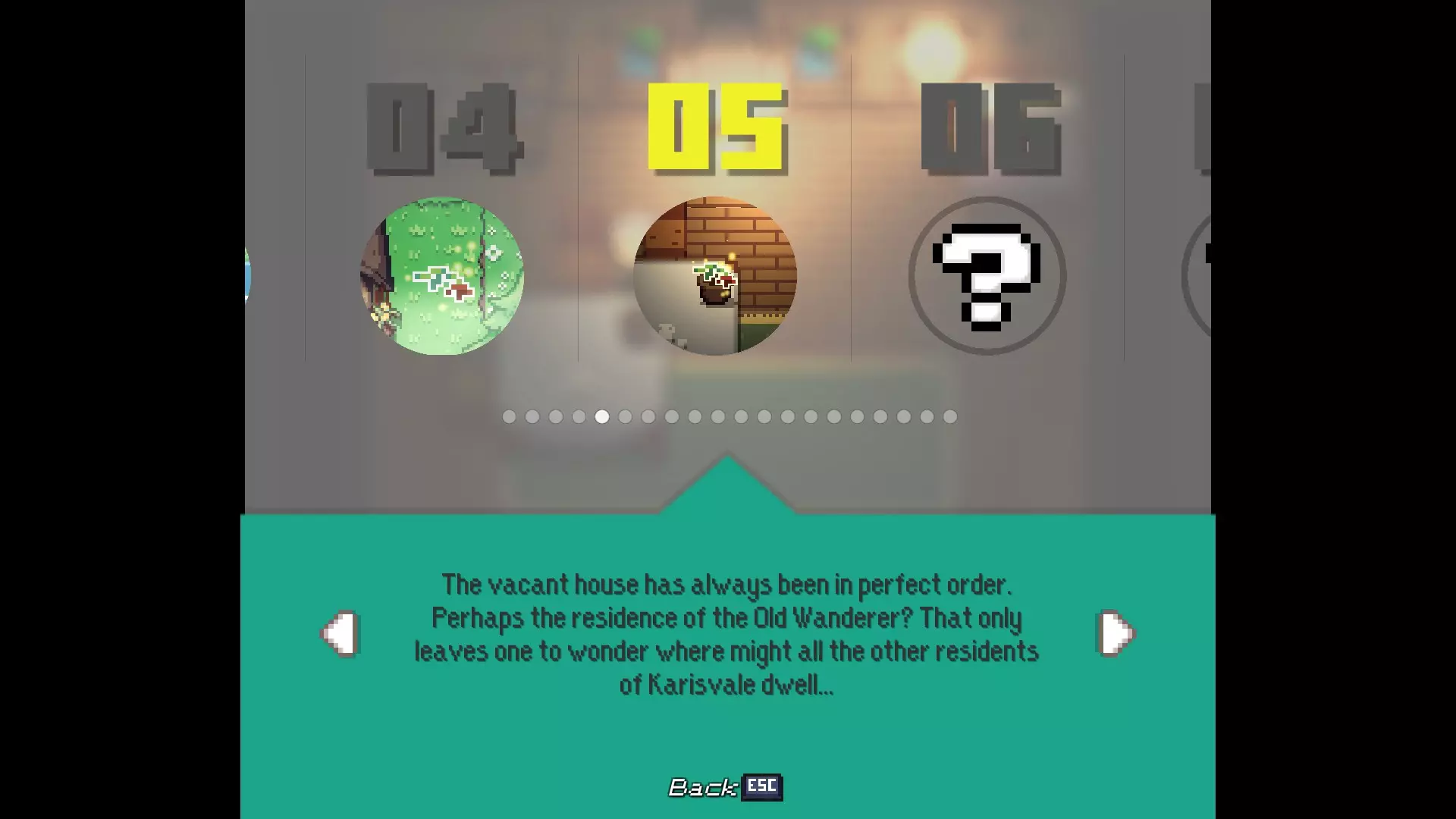 多嘴多舌 与卡里斯维尔的每位居民对话。 - 老流浪者:卡里斯维尔中心的男子 - 柴犬艾柯:卡里斯维尔中心的狗 - 伊茜-贝茜:卡里斯维尔中心北出口的女子(进入镇长宅邸前) - 密涅瓦女士:镇长宅邸向北一个屏幕处的女子 - 瓦伦丁镇长:镇长宅邸内,密涅瓦女士位置向西一个屏幕处 - 瞌睡乡巴佬:遥远的灌木丛,从11/20的枯萎花朵处向北走 - 老熊:衰老山脊的房屋内,下楼与熊对话 - 卡拉女士:衰老山脊的房屋内,上楼与女子对话 - 迷路男子:衰老山脊的房屋内,下楼后坠入洞穴,前往北出口并穿过钢门
