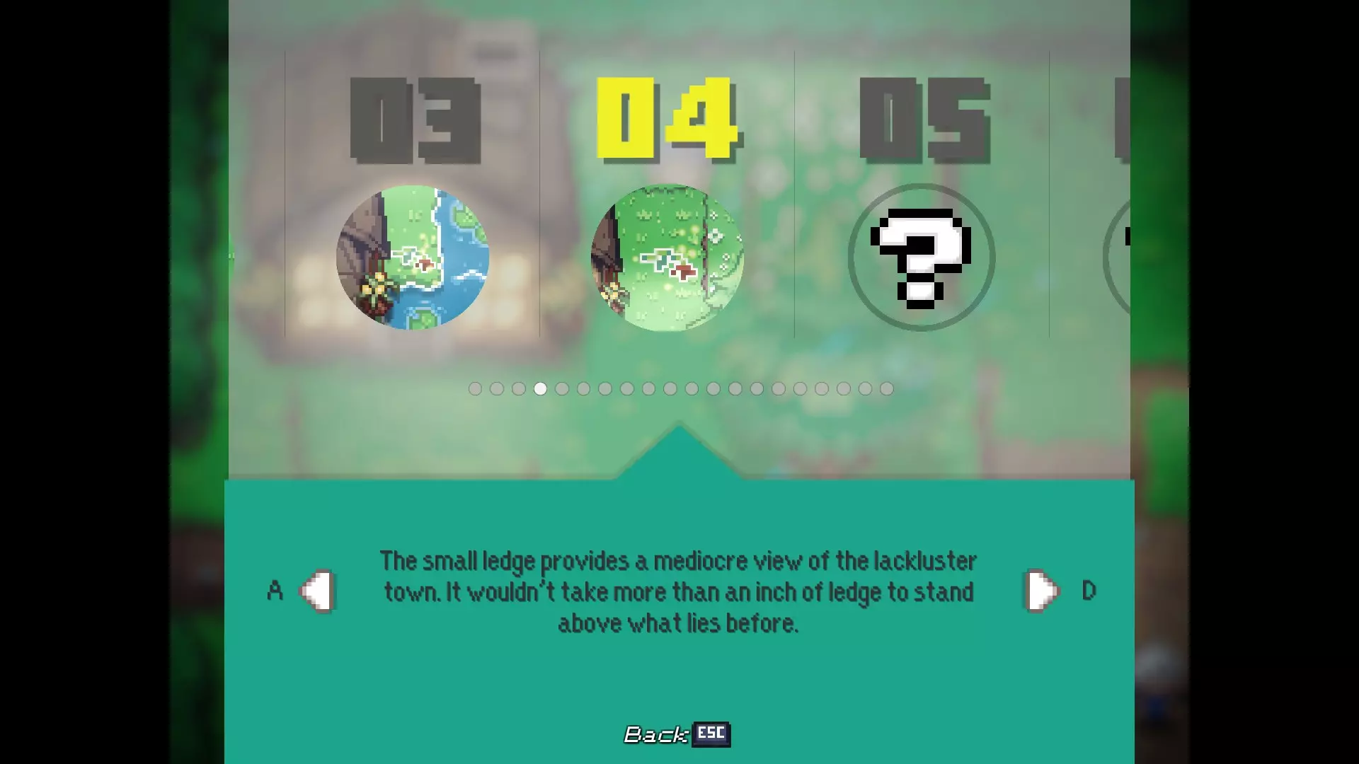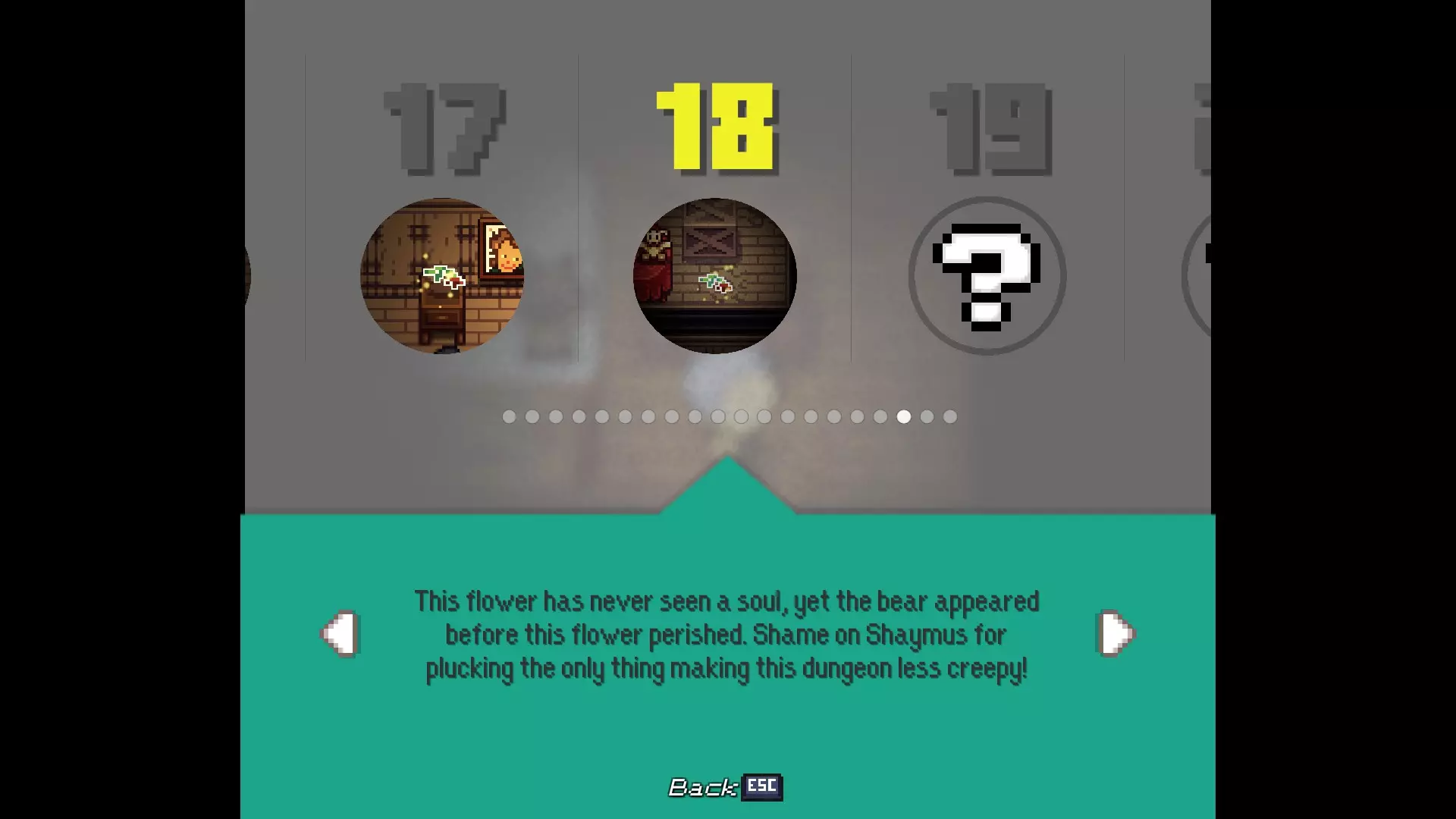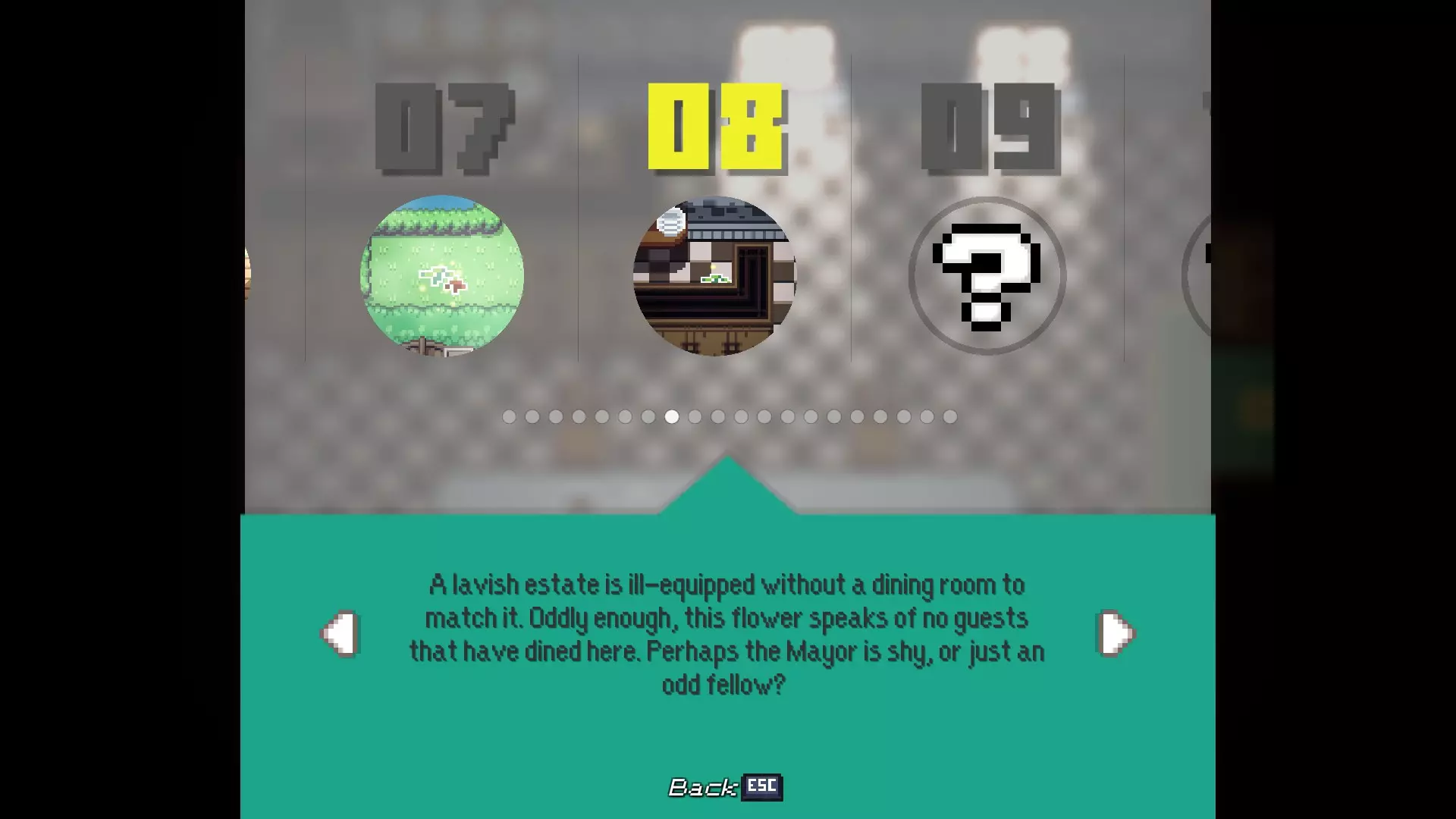 多嘴多舌 与卡里斯维尔的每位居民对话。 - 老流浪者:卡里斯维尔中心的男子 - 柴犬艾柯:卡里斯维尔中心的狗 - 伊茜-贝茜:卡里斯维尔中心北出口的女子(进入镇长宅邸前) - 密涅瓦女士:镇长宅邸向北一个屏幕处的女子 - 瓦伦丁镇长:镇长宅邸内,密涅瓦女士位置向西一个屏幕处 - 瞌睡乡巴佬:遥远的灌木丛,从11/20的枯萎花朵处向北走 - 老熊:衰老山脊的房屋内,下楼与熊对话 - 卡拉女士:衰老山脊的房屋内,上楼与女子对话 - 迷路男子:衰老山脊的房屋内,下楼后坠入洞穴,前往北出口并穿过钢门