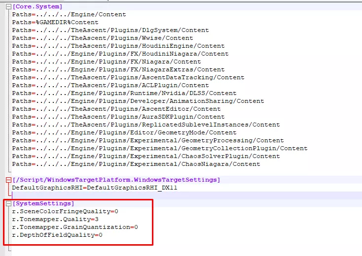 修改配置文件设置 按下Windows + R键 输入 - %LOCALAPPDATA%TheAscentSavedConfigWindowsNoEditor 用你常用的编辑器打开Engine.ini文件 在文件末尾添加以下内容 [SystemSettings] r.SceneColorFringeQuality=0 r.Tonemapper.Quality=3 r.Tonemapper.GrainQuantization=0 r.DepthOfFieldQuality=0 效果应该如下所示: