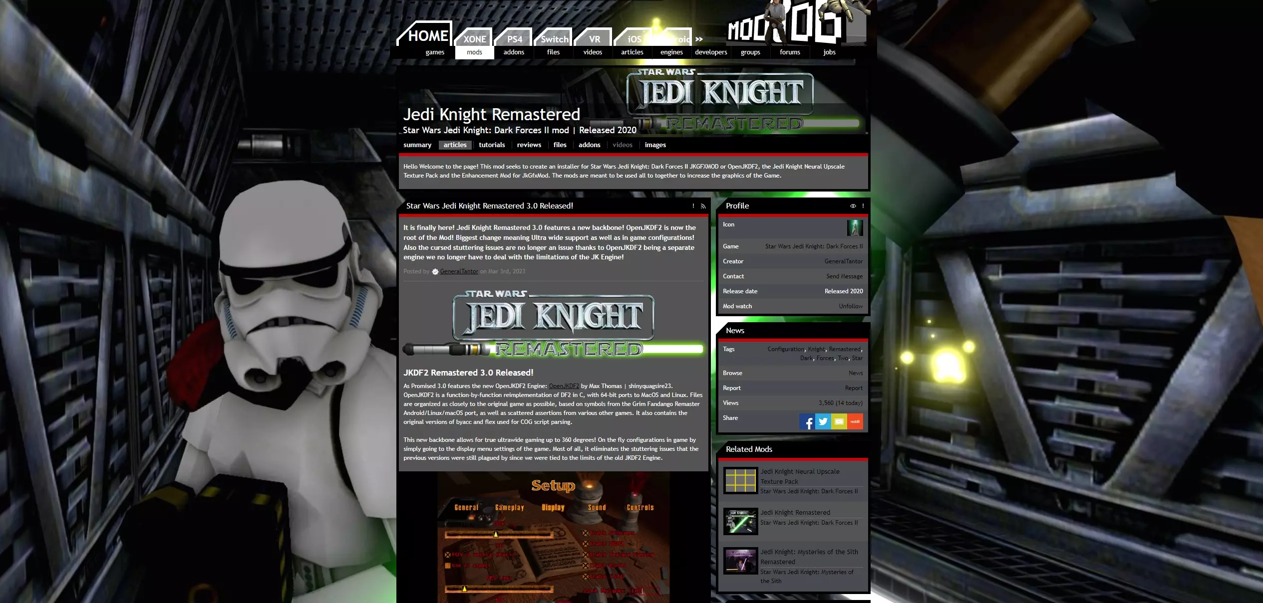 本指南展示了在Win 7/8/10/11系统上获取游戏【重制版/高清版】(包含硬件加速、兼容性修复、高分辨率支持、新纹理、优化模型、视场角配置等功能)的最简单方法。我制作本指南的原因是,和许多人一样,我在游戏中遇到了诸如添加模组后出现黑屏,或无法直接通过Steam运行模组化游戏等问题。因此,我制作了这份简单的指南,希望能在我对《星球大战绝地武士:黑暗力量II》进行模组化“冒险”之前就拥有它。本指南创建于2020年,并会在模组创作者GeneralTantor更新模组时同步更新(当前版本为3.2)。本指南: 提供一个模组安装包的链接(没错,就是包含OpenJKDF2、绝地武士神经网络高清纹理包、JkGfxMod增强模组(JK版)1.0的那个), 解释如何安装该模组(这绝非难事)以及如何在模组设置中配置游戏(只要知道方法就很简单), 解释首次启动模组化游戏的方式以及如何在游戏设置中进行配置, 解释如何将模组化游戏与Steam整合(直接从Steam启动并使Steam覆盖层正常工作)。 下载并安装模组安装包 更新! 模组包作者GeneralTantor已于2023年7月30日将其更新至3.2版本。因此本指南也已同步更新, 请查看Mod DB上的绝地武士重制版项目网站。该模组包的作者提供了关于整体及各组件的简要信息(若你想单独安装各组件,可查看相关链接)。包含模组信息的截图:
