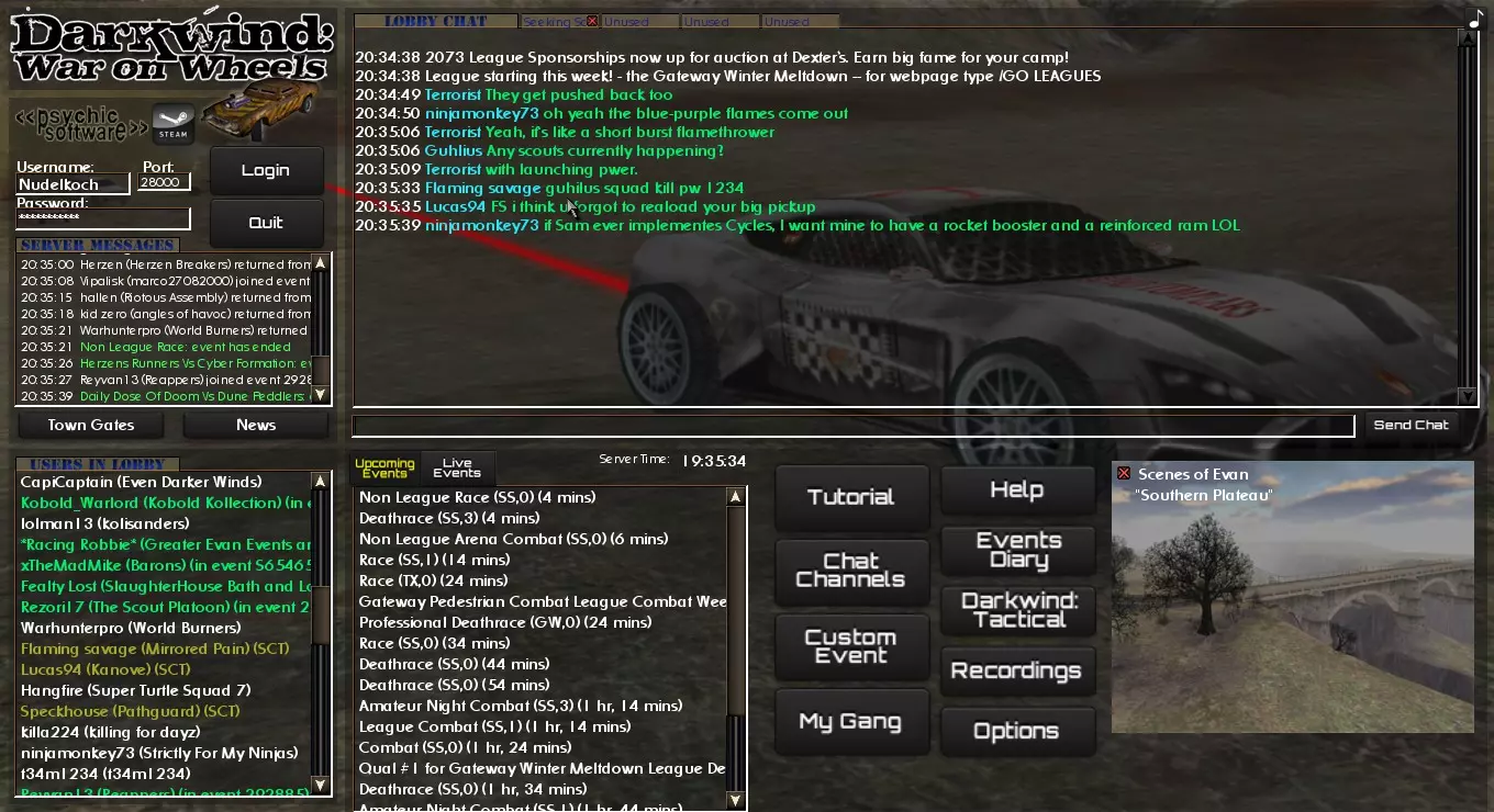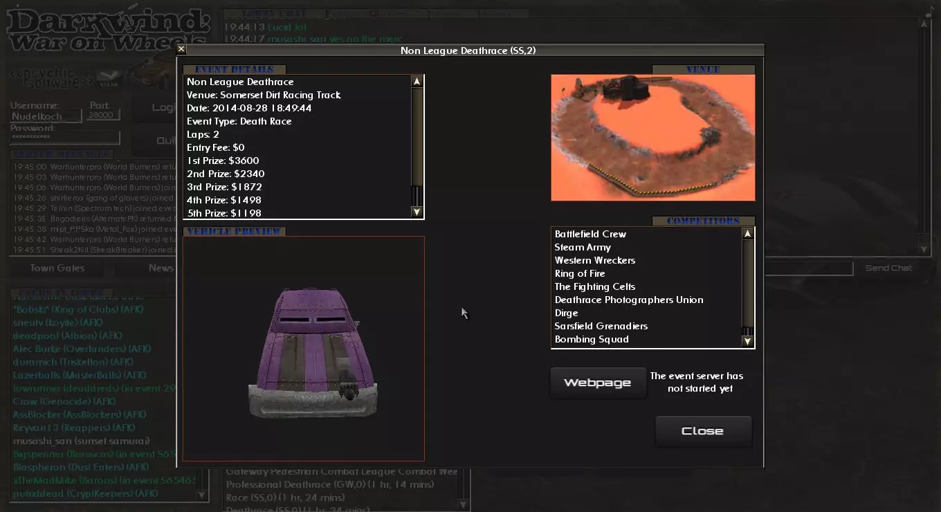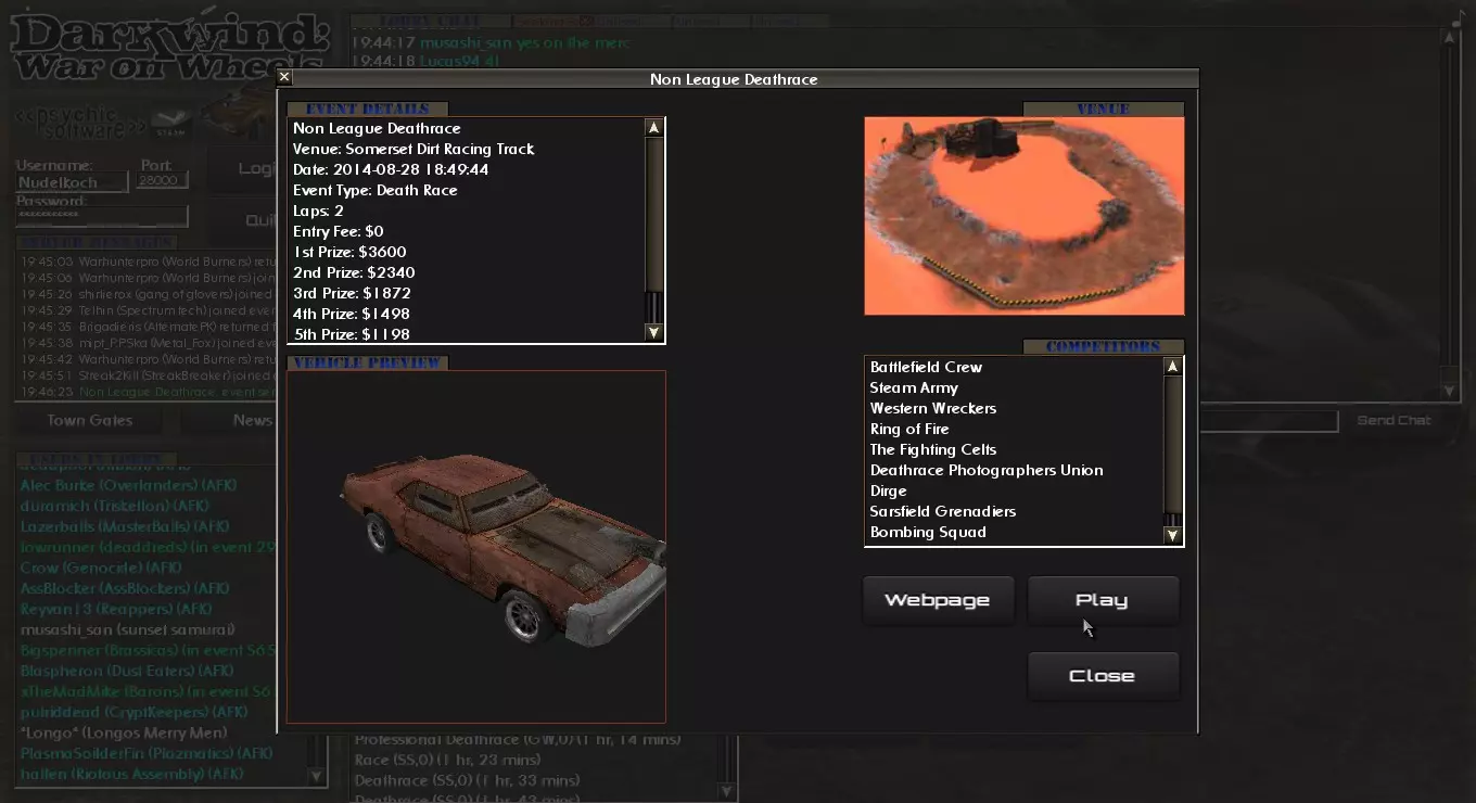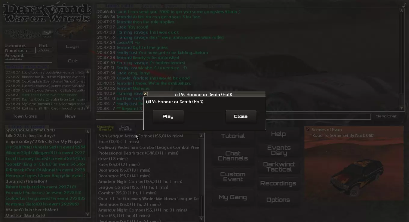 如何使用用户界面。基本上是除了控制车辆本身之外的所有操作。 简介 你刚入手《暗风:车轮之战》,启动游戏,完成了教程,现在却不知道该做什么? 那么这份指南正是为你准备的。 本指南将向你展示如何参与《暗风:车轮之战》中的各类活动。 城镇基础活动 在你能参与侦察任务、开始交易或从城镇酒馆接取任务之前,你需要钱来购买或租用一辆车。当你没有车时,获取资金的一个简单方法就是参加非联赛活动。 活动有三种类型:竞速、死亡竞速和战斗。你需要找出自己最擅长的类型。 那么如何参加这些活动呢?一旦你了解方法,就会发现其实并不难。第一步:找到一个你喜欢的赛事,在这个例子中我选择了一个竞速赛事。
