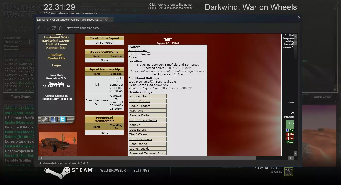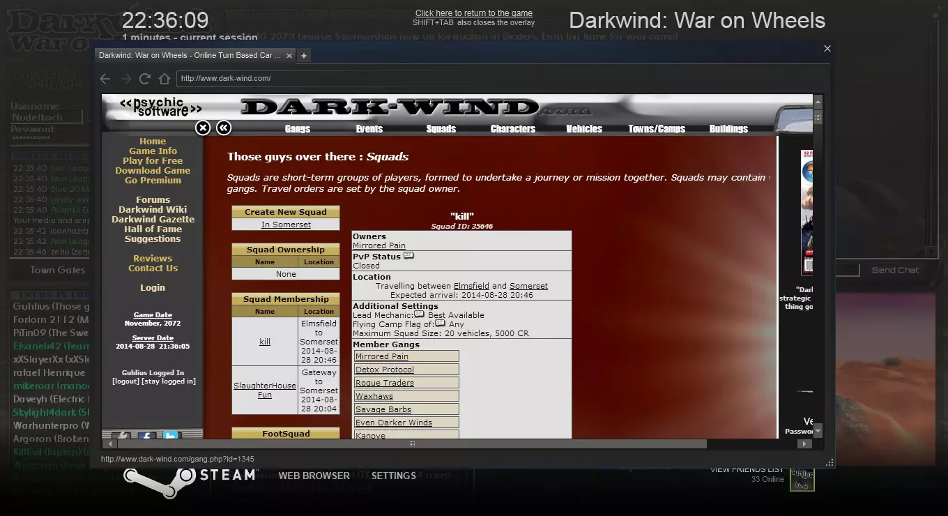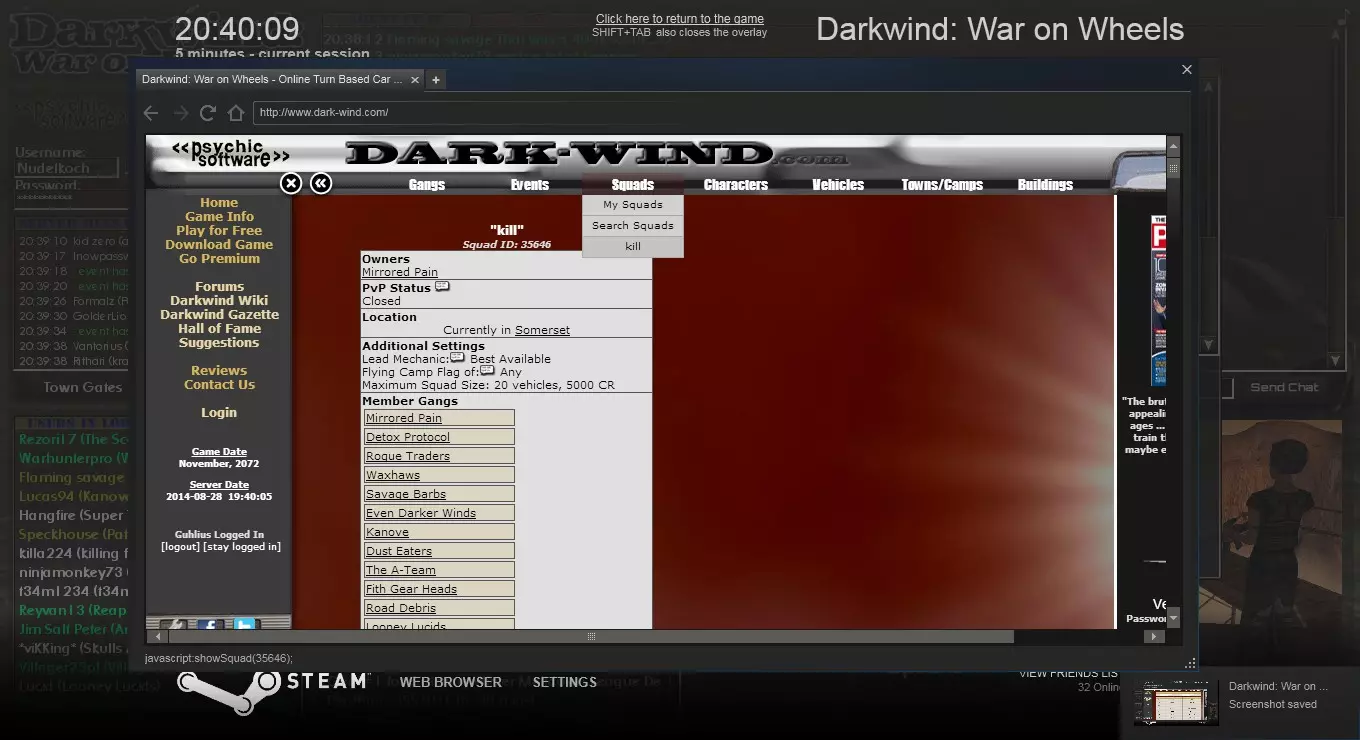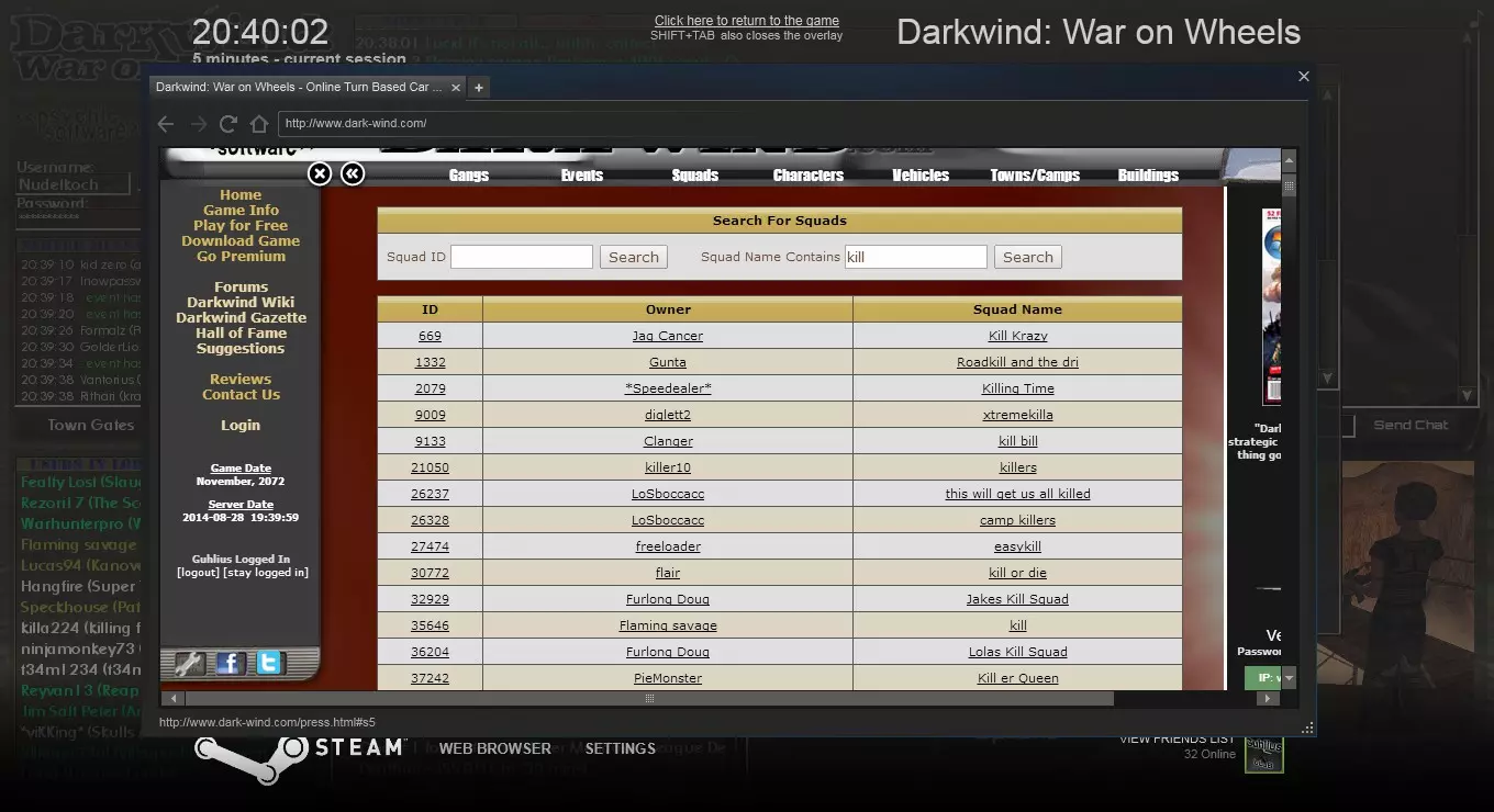 方法二 使用你设置的组合键打开游戏内浏览器,访问相关网站,或点击左上角的【Darkwind】标志。然后选择【队伍】->【搜索队伍】,输入队伍名称并点击搜索结果中的队伍。接着向下滚动,输入密码,点击【加入队伍】。