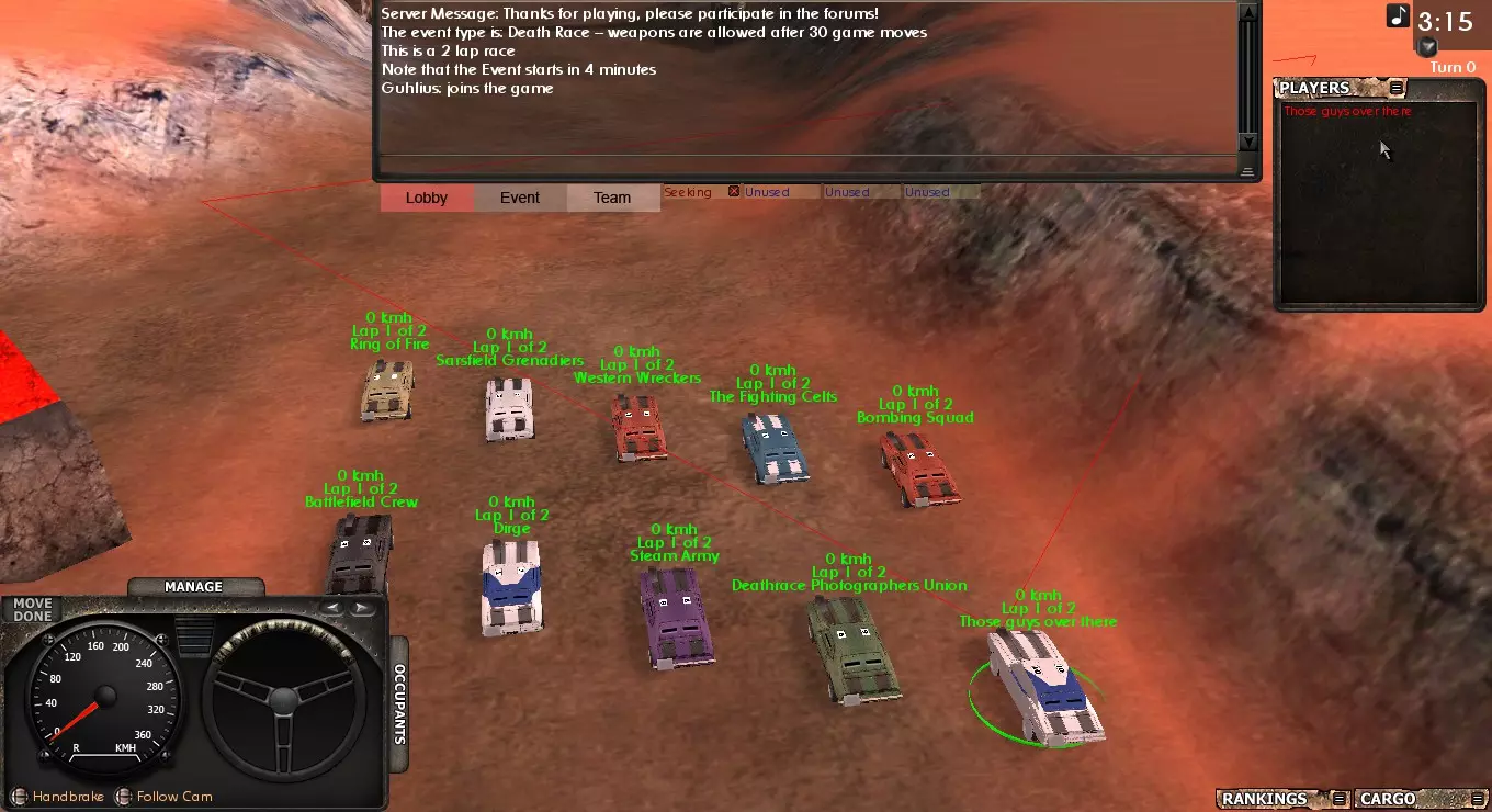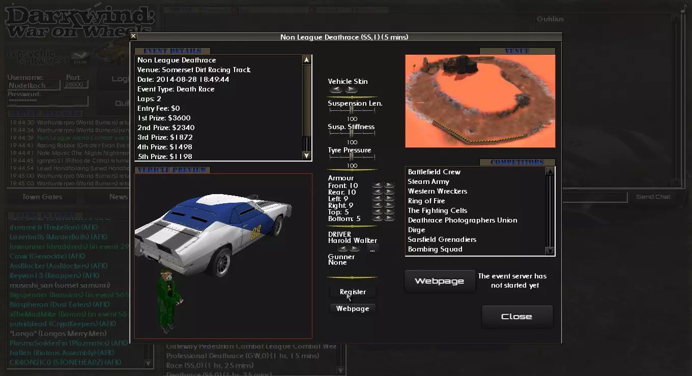 在这里你可以设置车辆的装甲值、指定驾驶员,以及调整悬挂和轮胎。完成设置后,点击车辆下方的小注册按钮(你可能需要滚动页面才能看到)。 步骤3:等待赛事服务器创建。如果你关闭了步骤2中的窗口,播报员会提示赛事即将开始,届时会弹出一个新窗口,显示内容如下。
