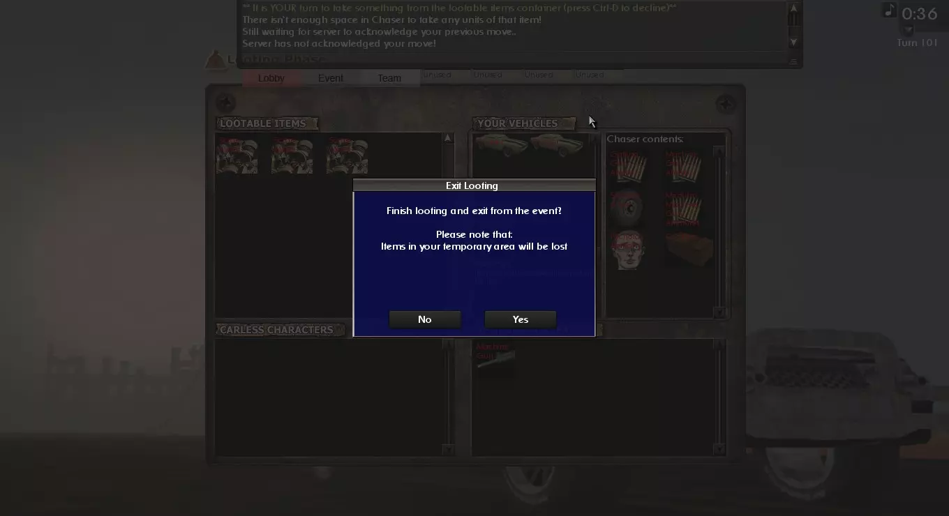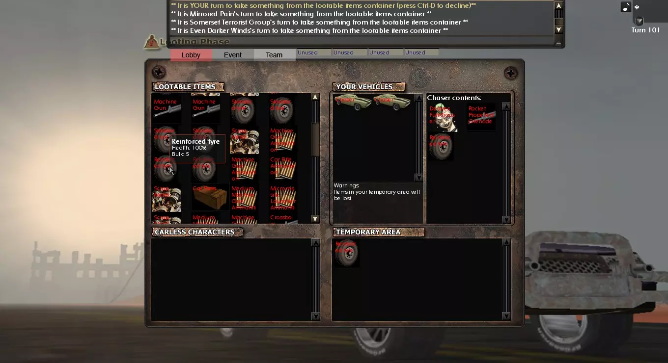现在所有人轮流从战利品菜单中拿取物品,将其拖到车辆或临时空间中。名称后带有星号的车辆拥有特殊外观。临时空间用于存放战利品,方便你将其塞进自己的车辆,如果你有战利品车的话,也可以塞进战利品车。每辆车都需要一名司机。有时资深玩家会为新玩家带来一些司机,这些司机会被放置在无车空间中。你可以用他们来驾驶战利品车回家。完成后,直接离开活动即可。