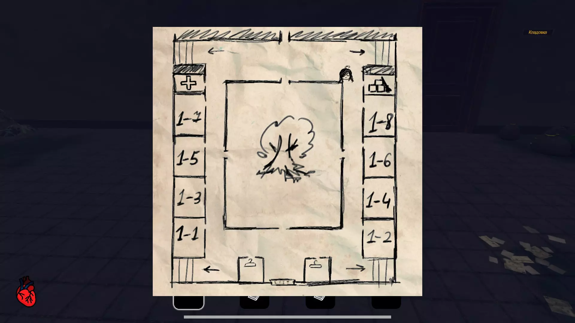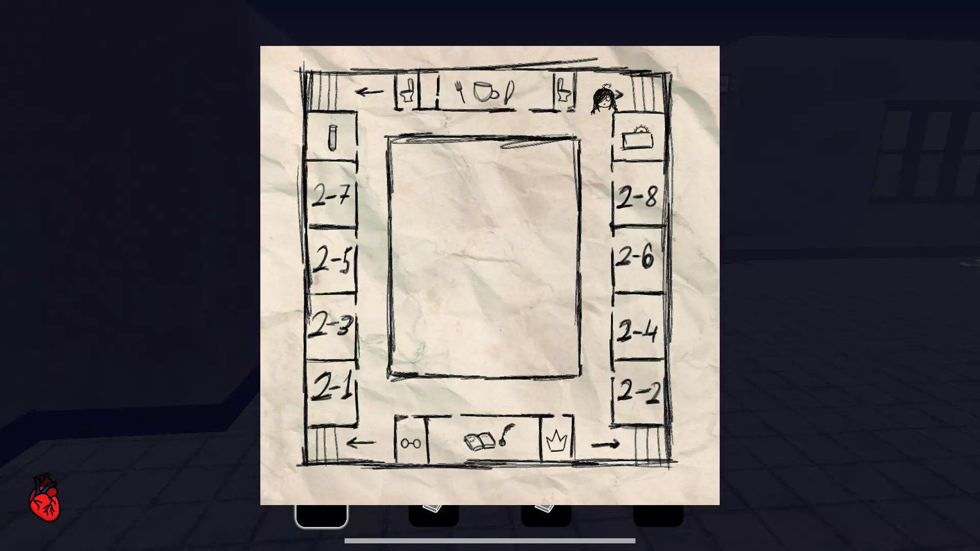 邪恶的居所 来到与代的家 结局4:要达成此结局,需要收集全部五盘磁带,然后前往校长办公室。注意:此时不能收集全部日记页面。 地图 在简单难度下,有一张建筑地图可供使用,它位于初始房间。