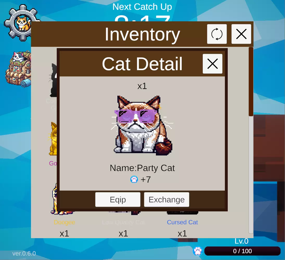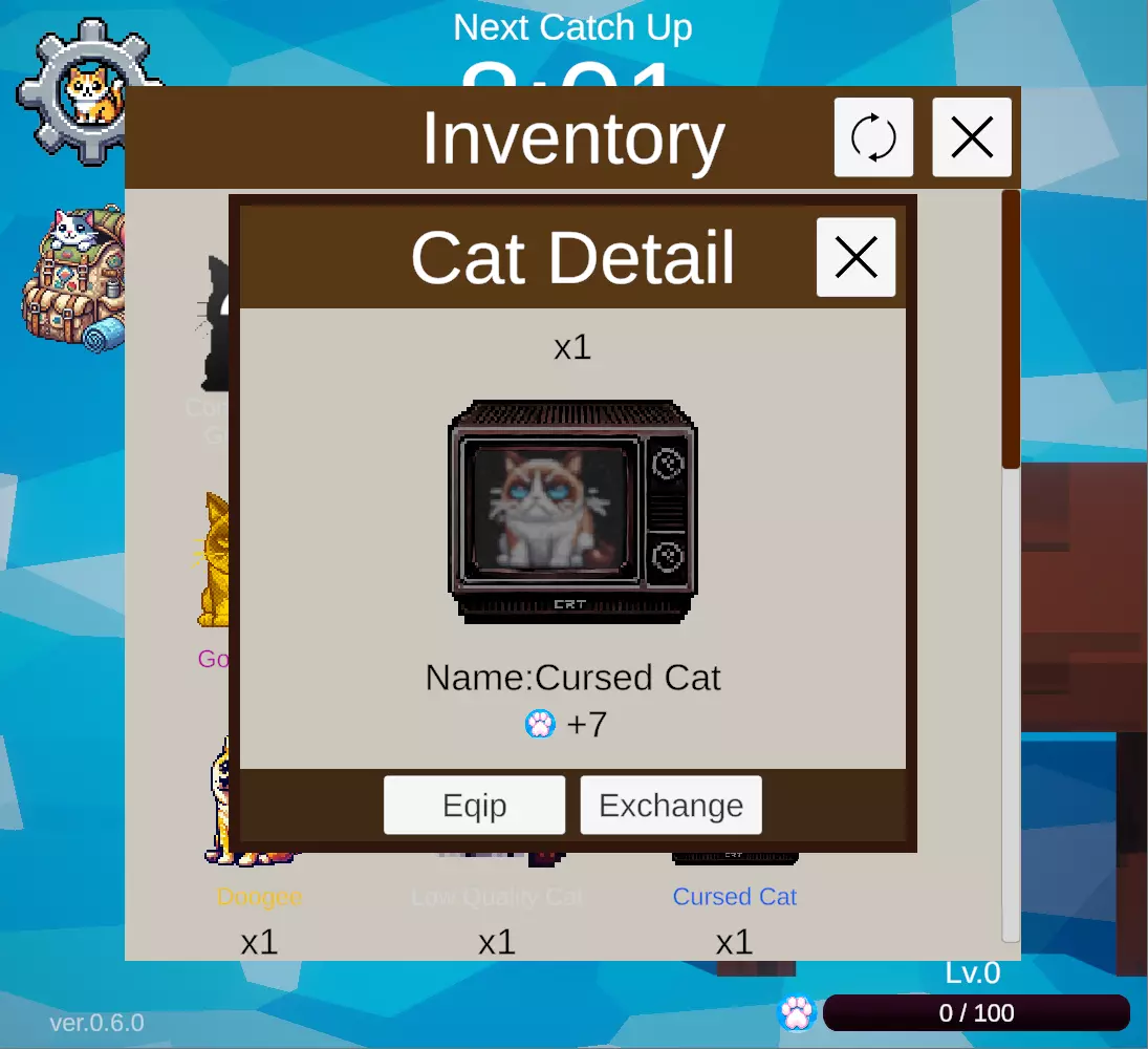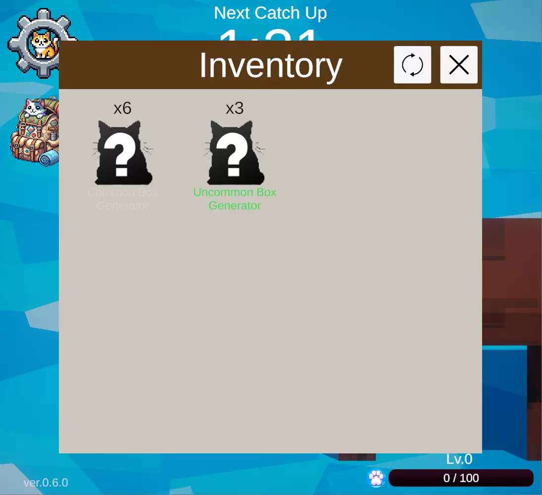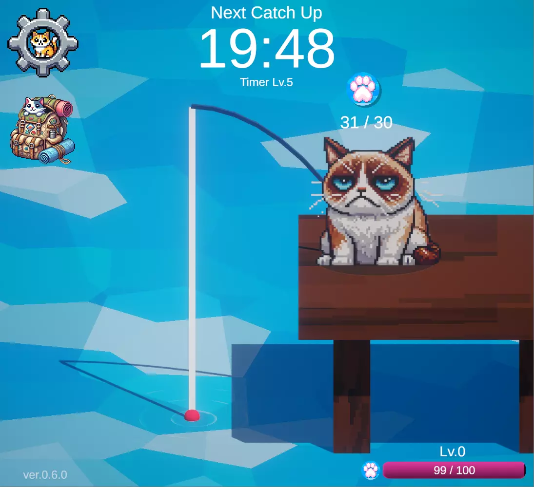 每当屏幕顶部的计时器归零时,就会钓上来一只猫。 钓上来的猫会自动放入背包。 通过物品菜单中的盒子生成器,你可以从盒子生成器中放出猫,并查看自己钓到了什么样的猫。
