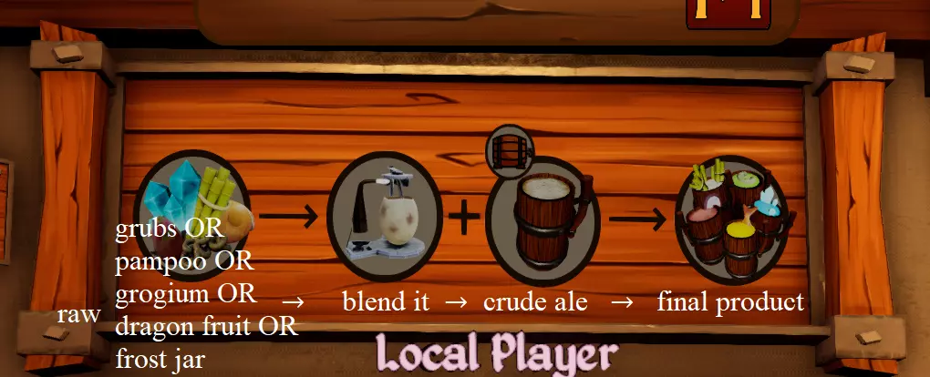 当你看到【在此补货】的提示时,你可以购买日常菜单所需的物品。在右侧,你可以找到菜单所需的食材,点击它们将其添加到【购物车】中。当购物车中的物品达到10个或你满意时,按【购买】按钮(如果不小心点击了不想要的食物,可以按【清空】按钮)。你可以多次打开补货界面,所以想买多少就买多少,或者根据自己的能力购买。购买后,会出现一个或多个箱子。至于菜品,只需靠近标有【?】的空箱子。长按【E】键,或者走到对应食材的箱子旁,即可添加食材。长按【E】键可以移动箱子,即使箱子不是空的也可以交换位置。现在,你可以取用并补充食物了。你也可以将物品丢弃到【垃圾桶】中,比如食物(未加工的食物丢弃后可获得一些金钱返还)、锤子等,或者等待它们自行消失。 PS:如果白天某种食物耗尽也不用担心,你仍然可以购买,但需要付出代价:要么等待不到30秒,要么支付少量金钱进行即时配送。 【烹饪与上菜】 当订单挂在订单架上后(这还用说嘛...),你会在右下角看到顾客想要的菜品。是时候开始烹饪、调制,或者直接拿取【粗制小吃】/【粗制麦芽酒】然后...上菜啦!烹饪食物时,只需从箱子里取出食材,放在你拥有的两个烤架中的一个上。如果顾客想要常规烹饪的食物,等待第一个进度条完成即可;如果食物图标上有黑色图案(根据我的经验,通常是龙类顾客点的),则需要等待第二个进度条(也就是最后一个)完成。无需准备菜品;当你将其端给正确的顾客时,它会自动出现。【仔细看顾客的名字!】你很快就能上手的,伙计。 【搅拌机】 我们终于迎来了这个界面的更新!(虽然从美观角度看它更简洁、更清晰,但遗憾的是,对于新玩家来说,我不确定它是否更容易理解) 现在开始“搅拌”你的朋友吧!(开个玩笑,在游戏里你做不到……) 要开始了解它的工作原理,让我们从一个例子开始。以所需的食材为例,比如最上面的第一个(生格罗gium),然后不用烹饪,按“E”将其加入搅拌机。等待它搅拌完成(会有进度条显示),同时你可以去拿粗制麦芽酒。拿到后,你可以拿起它并自动混合……然后就完成了!你获得了右上角的第一个酒杯。