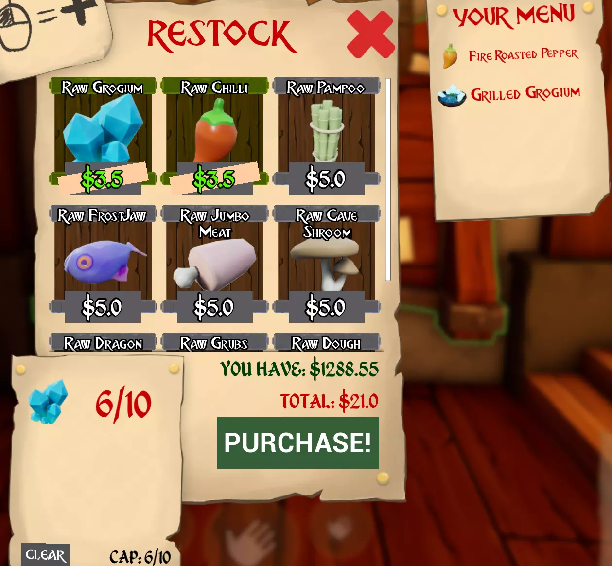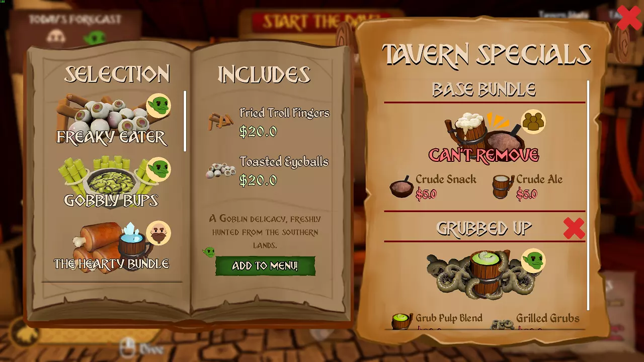 (你可以在右侧看到),按“E”键(打开菜单)。每天你都需要制作菜单。从左侧的选项中,点击一个可用的套餐,阅读屏幕中央“包含”下方的信息,包括所需食材。然后,将你喜欢的菜品添加到菜单中。做出选择前,要明智地留意当日的折扣。记住,菜单上的菜品越多,同一天需要准备的菜肴种类就越丰富,挑战也就越大。所以,为每个种族选择一种,或者如果你想迎接更困难(有时也更昂贵)的一天,可以选择两种。在右侧,如果你改变主意,可以从菜单中移除菜品,但基础套餐除外,当然,它是免费的,所以……按右上角的“X”键退出菜单。 补货