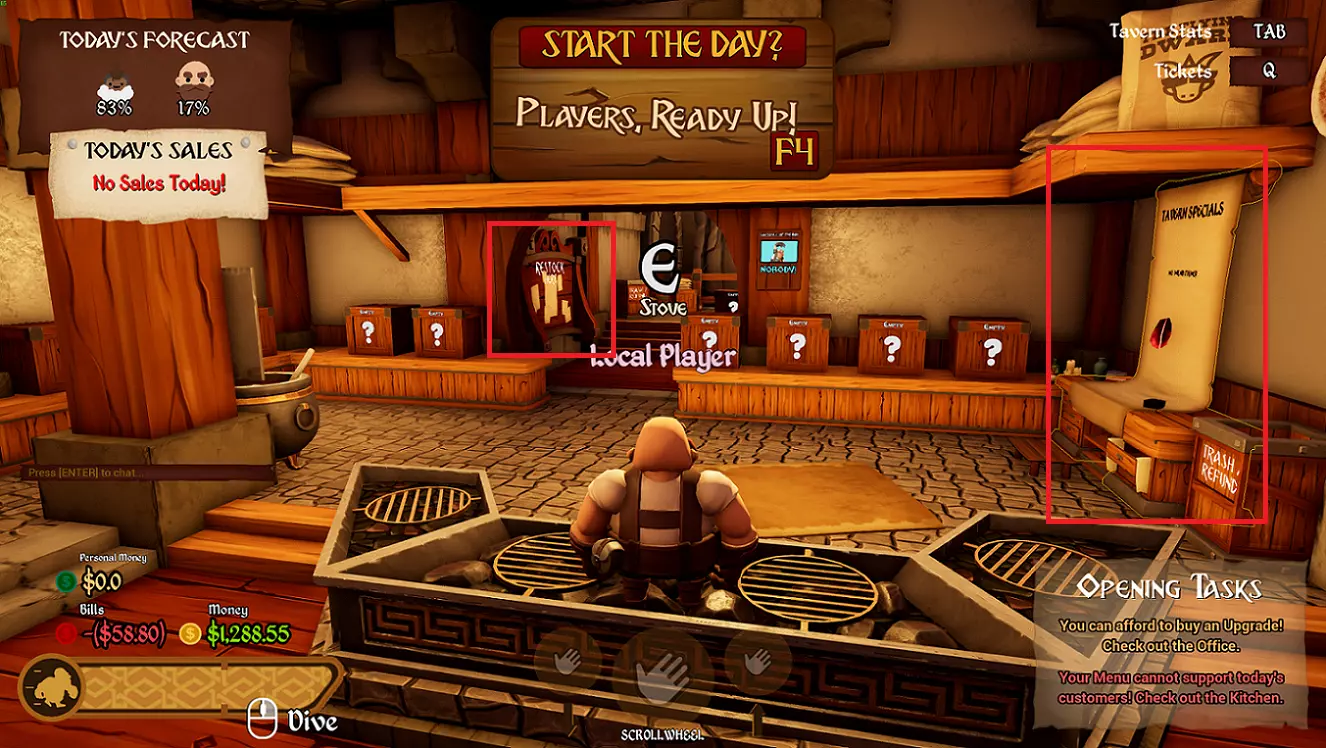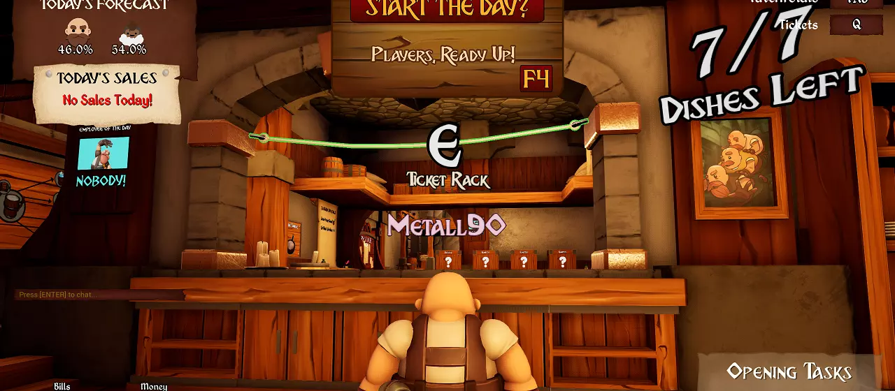 屏幕左上角→你可以看到今日预报。查看你将遇到的生物以及它们各自的百分比(这样你就可以计划购买和菜单——我稍后会解释)。此外,你还能找到今日特价!特价每天都会变化,所以尽可能多买些并存放在箱子里以备不时之需,因为现在有折扣,伙计! 屏幕左下角→账单(你将在一天结束时100%支付的钱,所以一定要满足账单要求!)、你的团队当前拥有的资金,以及随意花费的能力。你还可以查看耐力值,跑步和更多潜水活动会让耐力消耗得很快! 从2月9日的新更新开始,你还可以看到个人资金,你需要用这些钱购买酒馆外的皮肤。每天每个玩家获得的初始资金相同,但有一个队伍会额外获得3美元。部分帽子/皮肤可通过赞助代码、社区服务器或其他途径获取。Steam平台上有相关获取指南以及成就攻略。 右侧区域说明: 右上角→酒馆数据:按下Tab键,可查看队伍酒馆(你和同服务器好友所在的酒馆)、商店数据(包括星级评分,评分越高越好)以及酒馆能量条(带有木炭和火焰的房间称为【核心】)。此外,还能查看资金情况,右侧则显示所有钥匙。这是个很实用的提示!按Q键可查看票据,但…… 右下角→每天开始时,若你持有票据,可在右下角便捷查看。如果你不在白天时段,会看到开场任务。这有助于判断你是否能负担升级费用,或者你的菜单是否能满足【今日顾客】的需求,以便调整策略。 屏幕顶部中央6→准备开始新的一天?只有在一天开始前才会看到这个提示。按F4键准备就绪,你会看到自己的图标和名字显示为已准备状态。在这里,你还能看到其他所有同样准备就绪的玩家。当然,在新的一天开始前,你随时可以取消准备状态。 服务与菜品 前往服务台并按E键。顾客会跟随你到椅子旁,你可以自由选择座位。然后再次按E键。此时,他们最终可能会下单。但是,并非所有顾客都会下单!而且下单的顾客也不一定只点一次!接收他们的订单(部分票据),然后使用E键将其放置在票据架上,或者……瞄准后左键投掷!