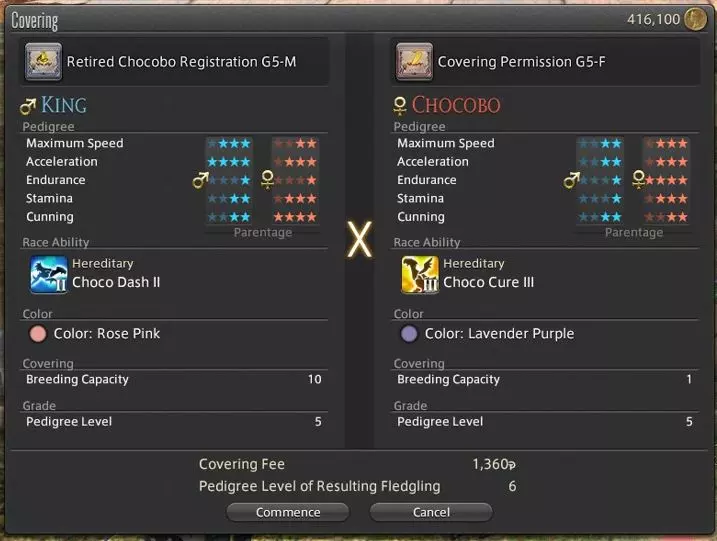 繁殖需要支付少量吉尔费用,且需30分钟现实时间。你会获得【配种证明】,之后需返回原处领取新陆行鸟! 领养新的雏鸟后,只需在金碟游乐场进行登记,就能再次带它参加陆行鸟竞赛。 新繁殖的陆行鸟会拥有比亲代更高的属性,还会随机继承父母一方的技能。通过持续繁殖,可以进一步提升陆行鸟的属性,从而参与更高等级的竞赛。 陆行鸟还有50%的概率继承父母一方的毛色。 你可以在角色-金碟游乐场-陆行鸟菜单中查看其当前的血统和属性。