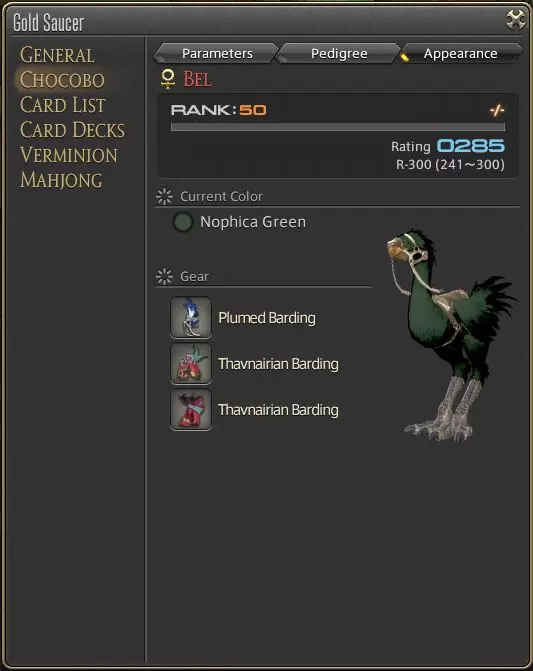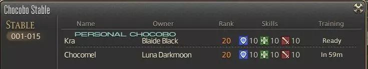 陆行鸟装甲的完整列表及获取方式可在此处查询。 陆行鸟竞赛 关于陆行鸟竞赛和繁殖,已有非常优秀且深入的指南,此处仅介绍基础知识。 解锁陆行鸟竞赛 要解锁陆行鸟竞赛,首先需要进入金碟游乐场。你可以通过完成15级任务“说不定会发生哦”来获得进入权限,该任务位于乌尔达哈现世回廊(X:9.6,Y:9.0),接取NPC为富有的年轻人。 进入金碟游乐场后,你可以使用以太水晶传送到陆行鸟广场。在那里,陆行鸟竞赛登记员会向你发布任务“想成为骑师吗”。该奖励会解锁陆行鸟赛跑以及你的第一只新手陆行鸟登记。你可以在G1-M和G1-F之间选择,这意味着你可以选择雌性或雄性赛跑陆行鸟(这纯粹是个人偏好选择,对属性没有影响)。 陆行鸟赛跑包含多个方面。我将分别介绍以下基础知识: 1. 你的赛跑陆行鸟 2. 赛跑 3. 赛跑技巧 你的赛跑陆行鸟 进行赛跑时,你会获得自己专属的赛跑陆行鸟,无法使用你的同伴陆行鸟参与。 和同伴陆行鸟一样,你可以通过【Insert】键打开菜单查看它们的属性。 你的赛跑陆行鸟有等级和评分。 等级 等级是陆行鸟的级别,会通过赛跑自然提升。最高等级为50级,但如果计划用于繁殖,可以在40级时让其退役。 陆行鸟每升一级会随机获得5项属性各1%的提升,同时获得一次训练机会。 达到10级后,陆行鸟将习得一项技能。 评分 陆行鸟的评分是其5项属性的平均计算值,决定了它可以参加的比赛等级。属性越高,陆行鸟就能参加更高评分的比赛,这些比赛难度更大,但也会提供更多经验值和魔导神典石。 (请注意,训练食物提供的属性不会计入此计算,训练部分会有更多相关说明) 此外,即使这不是你的同伴陆行鸟,你也可以为其装备鸟甲,这些鸟甲在比赛中是可见的。