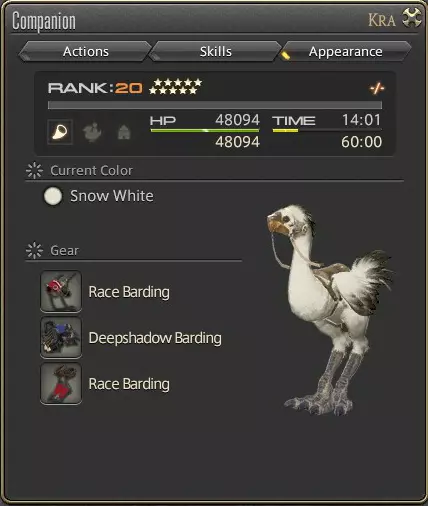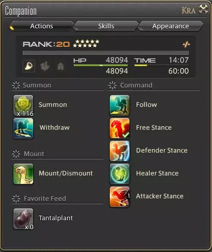 同伴菜单的第一部分会显示你可以选择的姿态。这些姿态也可以分配到快捷栏中以便快速使用。 你可以在队伍列表中你的陆行鸟名字处看到当前激活的姿态。 姿态 效果 跟随 你的陆行鸟不会参与战斗,只会跟随你。有助于脱离仇恨。 自由姿态 你的陆行鸟会从其所有可用技能中自由选择,并执行它认为最重要的操作。防御姿态:你的陆行鸟会攻击敌人,并仅使用防御系技能树中的技能。 治疗姿态:你的陆行鸟不会参与战斗,而是专注于治疗你和你的队友。 攻击姿态:你的陆行鸟会专注于攻击,并仅使用攻击系技能树中的技能。(请注意,召回并非姿态,它会完全收回你的陆行鸟,直到你使用吉萨尔特绿蔬菜再次召唤它。) 姿态推荐:几乎总是推荐使用自由姿态,因为你的陆行鸟能充分利用它拥有的所有技能,且不会因仅使用一个技能树而受到技能冷却惩罚。这意味着,在最高等级时,你的陆行鸟在自由姿态下会比攻击姿态拥有更高的伤害输出,因为它还能使用防御技能。 不过,如果你发现在某种情况下难以维持自身生存,建议将陆行鸟切换至治疗姿态。尽管技能的冷却时间仍然适用,但专注于纯粹的治疗可能会成为你能否存活的关键。 攻击姿态在你作为治疗职业刚起步时可能有用,初期需要一些额外的伤害输出,或者作为治疗职业时帮助加快击杀敌人的任务进度。 防御姿态则应尽量避免,因为陆行鸟产生的仇恨值无法与你自身相比,它很难拉住仇恨。如果你的陆行鸟正在攻击错误的敌人,你可以通过选择以下姿态来更改它攻击的目标,然后切换回自由姿态或攻击者姿态,并攻击你希望陆行鸟专注的敌人。 更改陆行鸟颜色和装甲 你主要可以通过两种方式自定义你的陆行鸟外观。 陆行鸟的颜色和装甲。 在陆行鸟菜单的外观标签中查看自定义选项和相关信息。