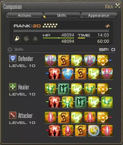 你可以在同伴菜单的第二栏中找到这个功能。 你有3种技能树可供选择: 防御者 治疗者 攻击者 每当你的陆行鸟提升一个等级,它就会获得技能点。你可以使用这些技能点从不同的技能树中购买技能。每个技能的花费等于其在技能树中的等级对应的技能点,因此技能树的第一个技能总是花费1技能点,第二个技能花费2技能点,依此类推。 如果你的陆行鸟升到20级,你将拥有足够的技能点来学习每一个技能。 完成一个技能树还会奖励你一件陆行鸟装甲。完成全部3个技能树可以获得3件陆行鸟装甲。 虽然可以混合搭配不同技能树的技能,但我个人建议选择一个技能树并专注投入。根据你的需求,应优先专注于治疗者和攻击者技能树,而防御者技能树则放在最后,因为其中的技能实用性最低。 每个技能树包含4个主动技能和6个被动特性。特性会提升你的陆行鸟的力量、生命值或精神。主动技能则能在战斗中提供帮助,比如让陆行鸟学会治疗你的法术或用于战斗的武器技能。你可以在同伴菜单中将鼠标悬停在各个技能上,查看其具体效果。 技能重置:若你对为陆行鸟选择的技能不满意,或想在不继续升级的情况下尝试其他技能树,可以通过给陆行鸟喂食里根辣椒来重置所有技能。你可以在部队补给官处花费48000部队徽记购买里根辣椒(需要达到少佐军衔),或在狩猎兑换商人处花费20个同盟徽记购买。接下来我们来了解一下你的战斗姿态。