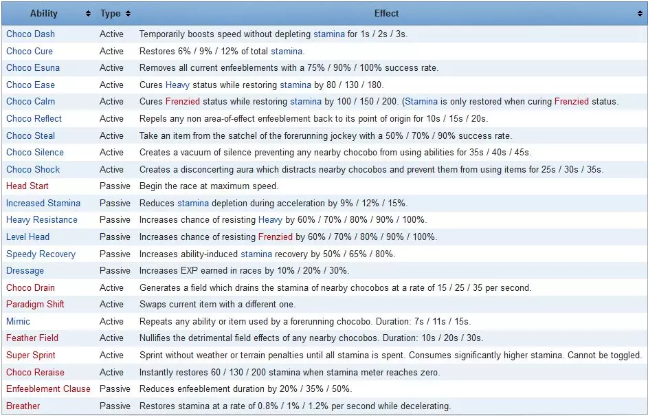 你的属性反映了你的陆行鸟的星级属性。对于9代陆行鸟,某项属性拥有4颗星意味着你将拥有500的最大属性值,但这并不代表你的陆行鸟当前属性是500/500。这就是训练的意义所在。 总览 属性 技能 食物 属性 每次你的陆行鸟等级提升时,它将获得随机的属性加成以及一次训练机会。 训练机会可用于给陆行鸟喂食特殊混合饲料,以提升其某项技能。你可以在你的陆行鸟竞赛菜单中查看剩余的训练机会数量。 要进行训练,你需要获得特殊混合饲料(稍后详述)并与陆行鸟竞赛训练师对话。在那里,你可以选择【陆行鸟训练】作为其中一个选项。以下是各属性及其具体作用的简要说明: 属性 效果 最大速度 影响陆行鸟的奔跑速度 加速度 影响陆行鸟达到最大速度的快慢 耐力 影响【汗流浃背】状态的触发时机,并减少耐力消耗 体力 影响体力总量 灵巧 影响陆行鸟在地形中的移动速度和体力消耗* *地形指赛道中上坡或有水覆盖的区域 技能 陆行鸟可拥有2个技能,一个为遗传技能,一个为习得技能。如果不给你的陆行鸟传授技能,它会在10级时自动学会一个随机技能。 你可以随时在陆行鸟竞赛训练师处使用遗忘之水来遗忘已学会的技能。遗忘之水可在马具饲料商人处用10点魔导神典石购买。若此后未给陆行鸟传授新技能,它会在下次升级时学会一个新的随机技能。 当你让陆行鸟退役时,可以称赞它的一项技能,这会使其成为该陆行鸟的新遗传技能,有可能遗传给后代。 技能分为主动技能和被动技能。主动技能的作用方式与竞赛道具类似,而被动技能会自行生效或只需进行少量调整即可激活。 你也可以从马具饲料商人处购买技能书来传授给你的陆行鸟。某些技能存在多个等级,其中一些需要通过挑战来解锁,这部分内容我将在下一节进行介绍。 技能及其效果: