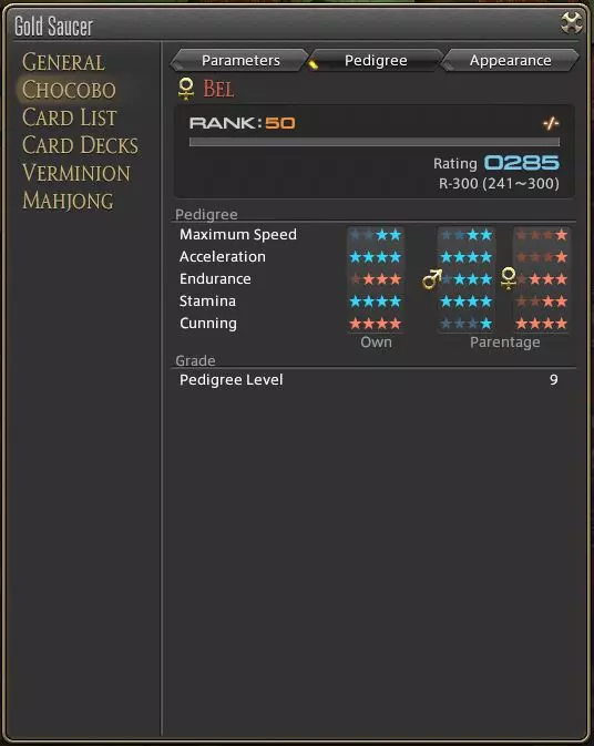 在界面侧边可以查看亲代信息。每一行星星都有一定概率被继承,这完全是随机的,与星星的品质好坏无关。颜色则表示你的陆行鸟是从哪一方继承的该特性。 如果采用正确的繁殖策略,你可以不断提升陆行鸟的星星等级,最终使每一行都达到4星。这需要进行近亲繁殖,并且要花费相当长的时间,因为你需要将多只竞速陆行鸟的等级提升到40级。 血统等级最高为9级,每提升一级,最大属性值增加40点。 训练 打开竞速陆行鸟菜单并查看参数时,你会看到类似以下的内容: