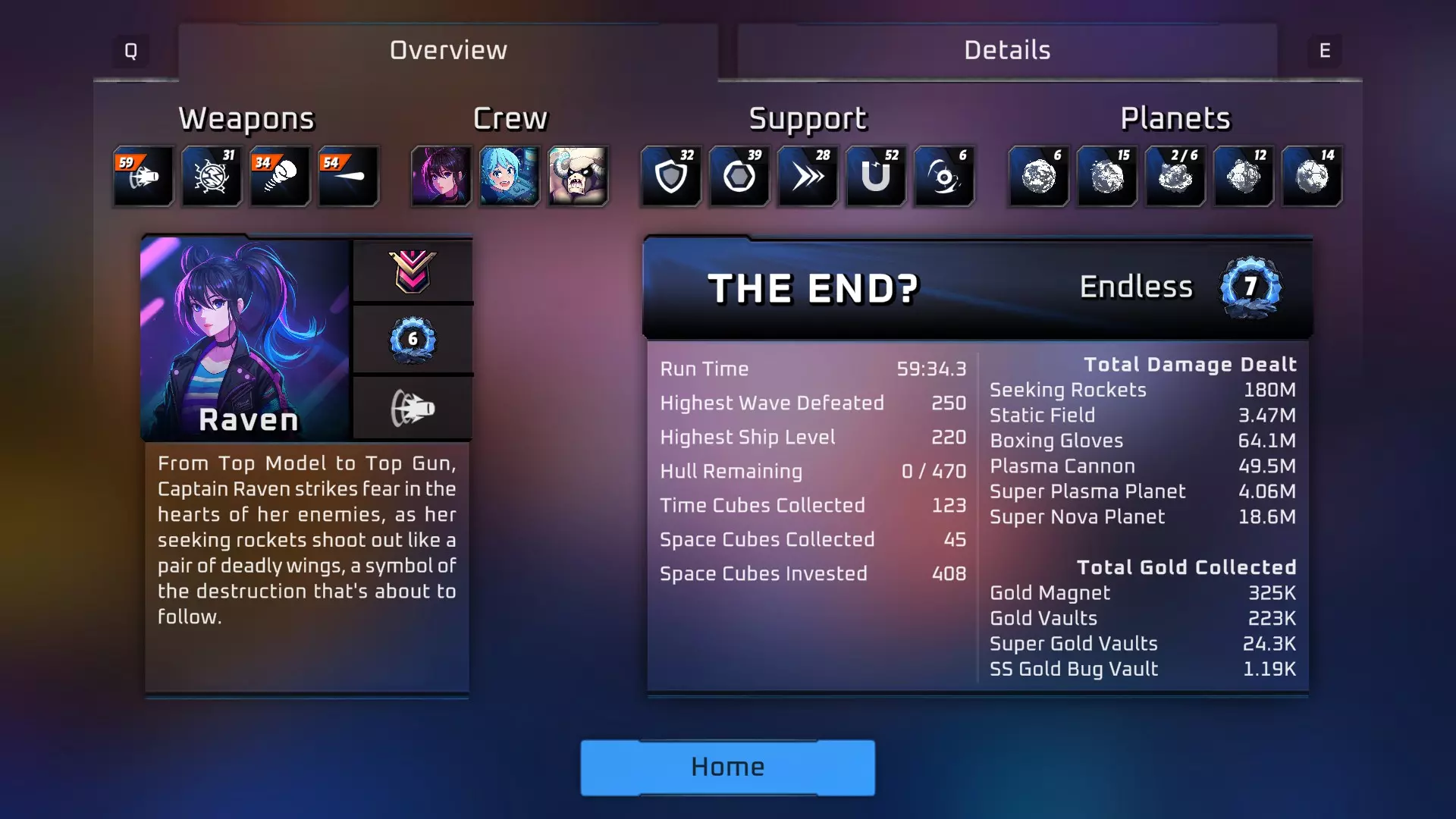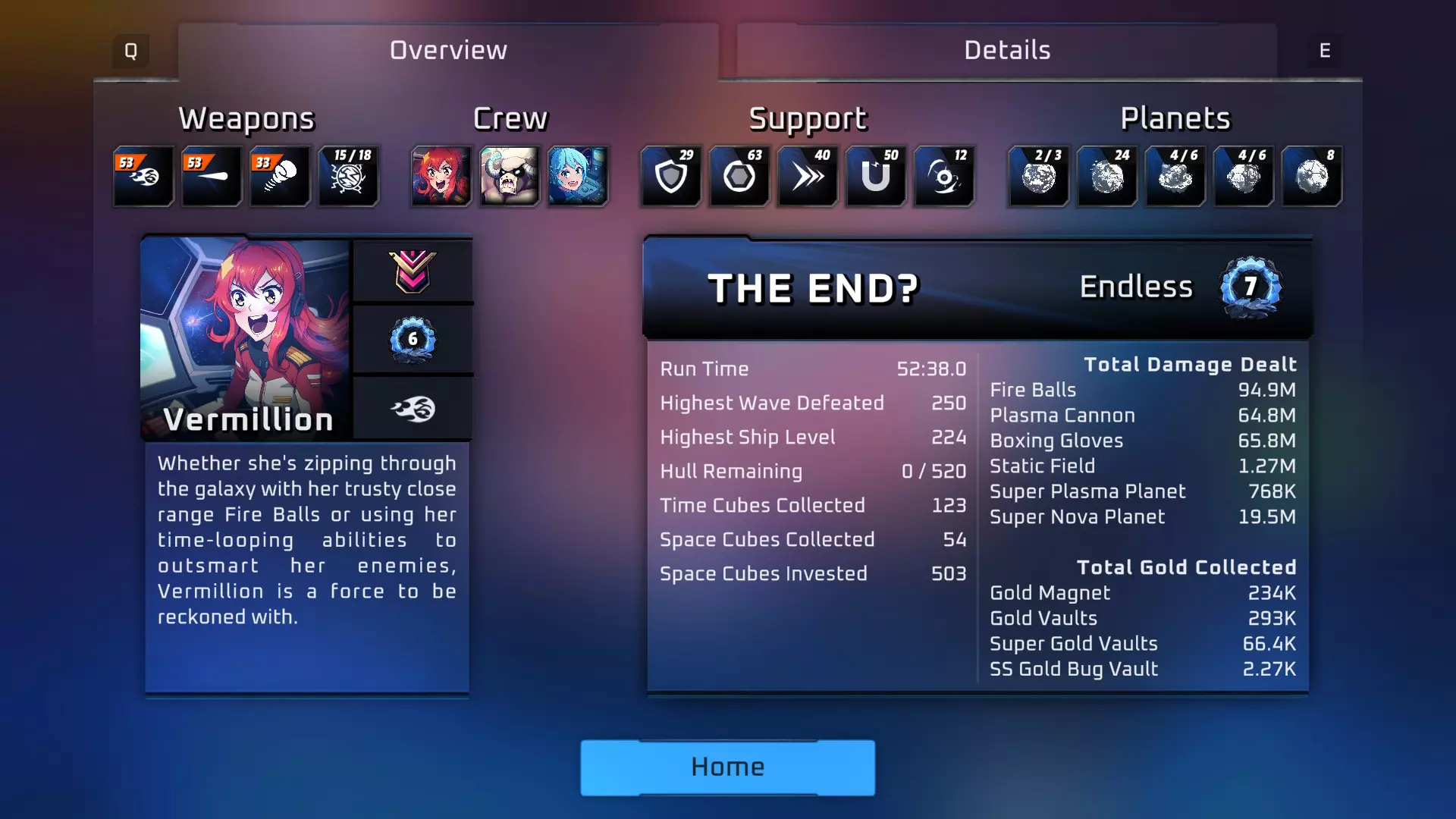 你应该先尝试解锁所有舰长的基础等级并解锁所有星球。在升级树中,为每个星球各投入1点,但在有多余点数前不必考虑其他升级。最终,你会为所有小型廉价的附带升级各投入1点,然后再专注于特定领域。 当你已为星球和主要舰长投入基础点数后,应优先将大部分点数用于提升太空立方体的收集潜力,因为这会加速整个元进度流程。 只为当前构筑升级舰长,但要先完全升级你的主要舰长,然后在你计划的船员每个部分各投入1点。在无尽模式中,想要突破100关,【静电场】或【武士刀】是必备的,但你的主要构筑应聚焦于三个关键功能,选择适合自己的能力。 - 近距离伤害与碰撞防御:手套是这方面的首选,静电场紧随其后,对于100关以上是必需的。武士刀在升级后表现出色,火球术在近距离伤害方面也很优秀。 - 远距离伤害:激光、等离子炮、导弹、特斯拉和新星。在我看来,等离子炮和导弹是最佳选择,新星在后期波次中效果不佳,无论提升多少伤害,似乎都难以压制敌人。 - 防御:所有舰长都能提供某种防御方面的次要加成。增益效果能提供一定程度的免疫和速度加成。护盾显然能提供相当程度的充能防御,让你的船体更持久地保持完好。船体强度就是你的生命值,可以通过拾取道具来补充。这三者对于你在更高波次中的生存都至关重要。敌人能造成超过100点的伤害,会迅速击破你所有的护盾并摧毁船体。 超越当前波次等级很重要。你需要最大化时间立方体和金币的收集,以保持足够的伤害和防御力来达到更高波次。初始波次会提供4个时间立方体和一个金币宝箱,在拾取完其他物品后,还需要等待约30秒才能获得第5个立方体。 升级优先级很重要。要知道金色星球拾取加成和普通(以U为标志)金色拾取加成之间的区别。我会按以下优先级进行升级,但列表底部注明的例外情况除外: - 超级升级(橙色的那些,不是超级星球升级) - 我的流派所需的新武器(顶部有NEW标签的武器) - 强化升级(特定升级数值为普通两倍/三倍的升级) - 船员/优质船员升级(通常能显著提升伤害/防御)我会跳过那些可能提升船员技能次要属性的杂项船员升级。- U金币拾取量 - 武器最高DPS升级 - 最显著的防御升级(护盾>推进>船体>每次拾取的船体值>格挡伤害) - 星球升级顺序(新星冷却时间>新星伤害>等离子炮塔>等离子伤害>其他任何星球冷却时间) - 其他我可能遗漏的内容 护盾冷却时间和充能很重要,已包含在上述“护盾”中。对于时间立方体商店,我有几个例外情况。我很少选择金币拾取量,而是会在商店中选择“每次拾取的船体修复值”,这样每次能增加25点,其他情况下则遵循上述规则。拾取金币加成的位置可能看起来有点奇怪,就在伤害加成的正上方,但这些都是常规的伤害提升,而且随着关卡推进,快速升级非常重要。只要能保持住,你会希望每波能升好几级。你的主要伤害将来自那些更优质的升级。 每20波或每个 Boss 战间隔,你大概能获得10个时间立方体(可进行2次商店访问)。 留意波数计数器。每第10、30、50等奇数10波是牢笼战斗,没有一些相当强力的武器很难脱身。你可以把新星星球留到这些战斗和 Boss 战中使用。 同样,每第20、40、60等偶数10波是 Boss 战,你会被困在一个无法逃脱的圆圈里。观察波数计数器,你可以判断 Boss 战中会出现哪些星球。根据战斗情况,新星星球和/或超级等离子星球可能会非常有帮助。有时我会尝试让时间立方体星球保持在圆圈内,以获取额外的一两个立方体,因为 Boss 战可能需要一些时间,而且通过保持距离不专注攻击它们的护盾,可以人为延长战斗时间。 当你突破 100 波后,每次拾取最好能获得 70 - 100 的船体修复量,因为这大概是你每次受到的伤害量。 超级等离子星球有一定帮助,但在大多数情况下可以算是新手陷阱。如果需要的话,可以在 Boss 战中使用。大部分时间应在黄金星球的边界内侧盘旋,以最大化你的等级提升。前往【太空立方体】、【时间立方体】、【船体修复】、【保险库】和【Boss】所在地。除此之外,尽量待在这里并生存下去。 每次Boss战后,静止的飞船会在随机星球周围生成,关闭该星球的功能并缓慢摧毁它。由于精英敌人会生成并追击你,应对这些静止飞船的最简单方法是围绕星球盘旋,在每艘静止飞船上空停留并缓慢对它们造成伤害。随着你升级并提升强化,这个过程会变得快得多,尤其是配备合适的近战武器时。 有些武器是前期的依仗,例如【新星】。这是一个很棒的新手技能,但它缺乏在后期持续发挥作用的能力。你需要用更高伤害的技能或更实用的技能来替换它,但在70多级之前,它是个不错的选择。如果开发者决定为它添加一个专精角色,它可能会变得更好。希望这能帮助到一些相对新手的玩家,或许也能给资深玩家提供一个不同的视角。