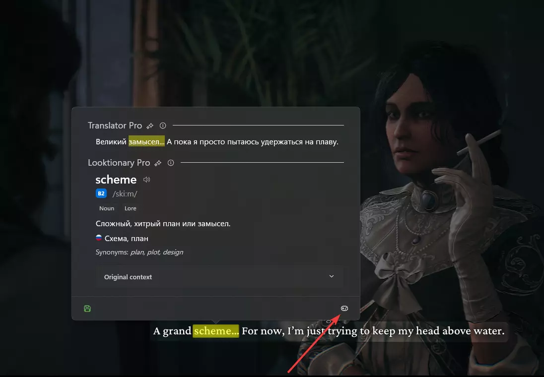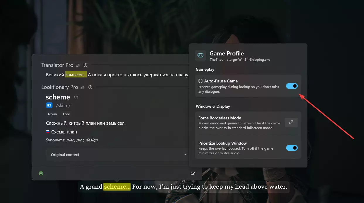 你也可以按下Alt+Q,无需将光标指向任何单词。此时程序会选中屏幕上的所有单词,你可以通过左键点击来翻译每一处不理解的地方。 该程序的核心功能是在翻译单词时能够自动暂停游戏。为此,需要在翻译窗口中选择游戏手柄图标,并启用第一个设置【自动暂停游戏】。