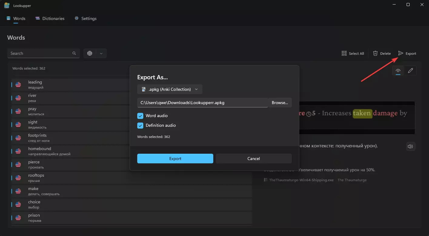 之后,在任何游戏中翻译单词时都会出现停顿,即使游戏本身没有这样的设置。 个人建议: 如果你的英语水平目前还比较薄弱,不要在游戏中翻译每个不认识的单词,更不要翻译每一份笔记。尽量去理解上下文以及剧情所讲述的内容。否则你很容易感到疲惫。Lookupper与Anki的集成 游玩后,您翻译过的所有单词会自动保存在程序的“单词”选项卡中。 前面我介绍了程序的免费功能,该功能仅限制每日翻译次数。现在来谈谈付费功能。最有趣的是:Lookupper订阅服务允许将您所有保存的单词导出为Anki卡片。Anki是一款免费的间隔重复学习程序。它能帮助你学习新单词并避免遗忘,从而大大加快学习过程。为此,在Lookupper的“单词”选项卡中,选择所有需要的单词并点击“导出”。指定保存单词文件的位置,并根据需要保留单词的发音及其释义。我通常会同时保留这两项内容。