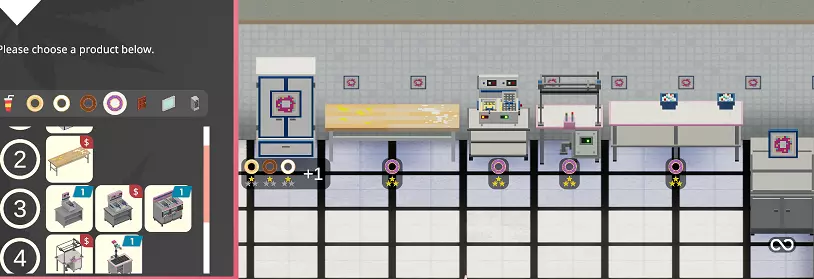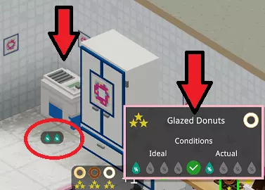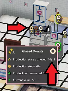 在甜甜圈的世界里,不存在1星品质! 说真的……你根本做不出1星品质的甜甜圈。甜甜圈储藏柜初始为1星品质,但生产链中的其他所有流程均为3星品质——这意味着你制作的所有产品默认都是2星品质。你会发现其他类似情况也是如此,比如那些困扰着我们城市街道的【Cloudy Meth】! 当前系统的机制似乎是:只要你的生产星级处于最低和最高可达成星级之间,产品就会是2星品质。 2星品质的甜甜圈每单位售价低2美元,但生产所需时间与其他品质相同。 饮料始终是3星品质……顾客似乎完全不在意你在冰块上做了什么手脚……受污染的甜甜圈似乎不会对价格产生影响,但食用它的顾客会在你的高级餐厅里生病,需要清洁工进行清理。