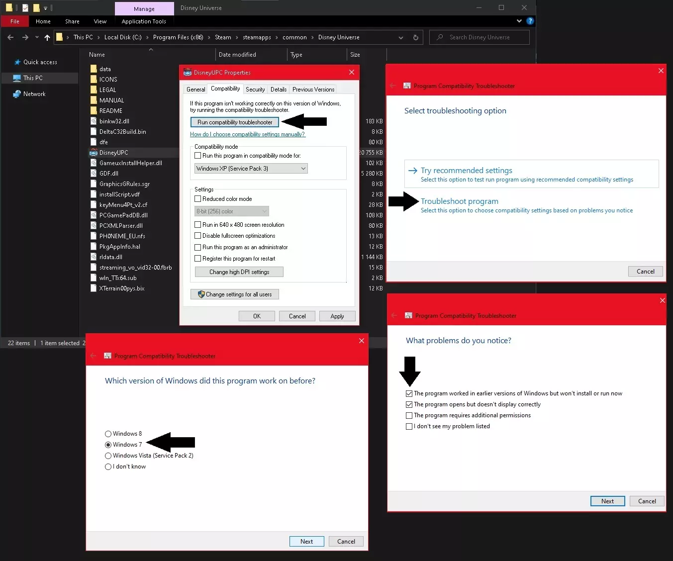 《迪士尼宇宙》白屏崩溃解决方法6: 1. 再次打开游戏目录中DisneyUPC.exe的属性。然后点击顶部的“运行兼容性疑难解答”按钮。 2. 现在选择“对程序进行疑难解答”选项,然后勾选前两个选项,即:“该程序以前能正常工作...”和“该程序能够打开,但无法显示...”。 3. 接下来会询问该程序之前在哪个Windows系统上可以正常运行,选择Windows 7。之后会提供一些选项以及“测试游戏”的快捷选项。 4. 你可以尝试它提供的各种选项并测试游戏,看是否有能解决问题的方法。找到有效的Windows修复组合后,不要忘记保存设置。