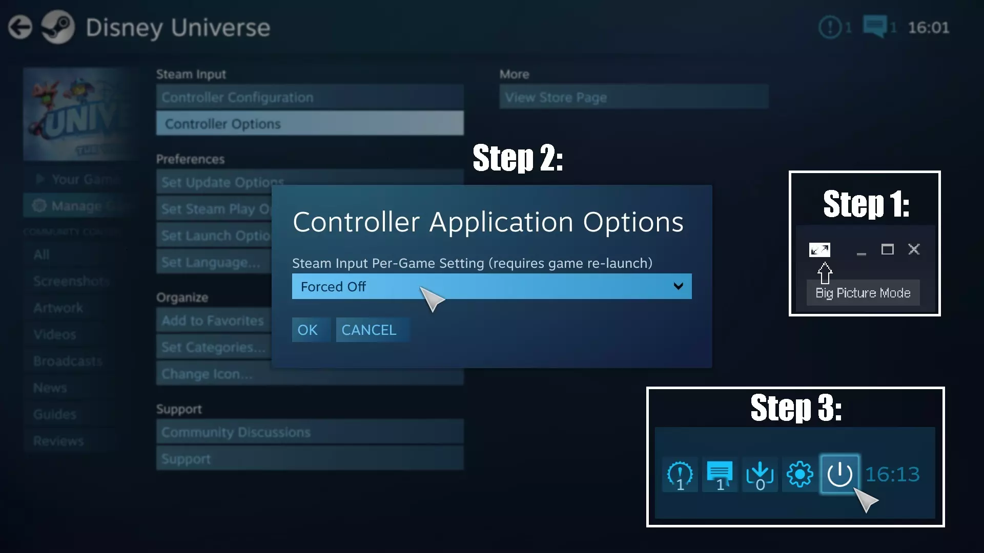 《迪士尼宇宙》白屏崩溃解决方法2: 1. 进入Steam大屏幕模式下的游戏库并找到你的游戏。 进入大屏幕模式的方法:点击右上角带有两个箭头的矩形图标。 2. 选择《迪士尼宇宙》后:在左侧选择管理游戏设置。 然后点击控制器选项,之后选择强制关闭选项。 3. 现在可以点击确定按钮并退出大屏幕模式。 退出大屏幕模式的方法:点击左上角的退出图标。