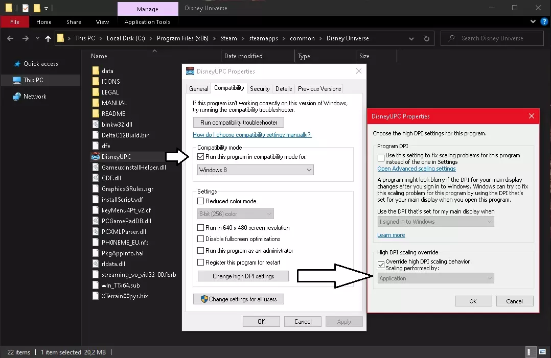 《迪士尼宇宙》白屏崩溃解决方法3: 1. 再次在库中右键点击游戏,选择属性。然后点击本地文件选项,再点击左侧的浏览选项。 2. 这将打开游戏文件所在的文件夹,在这里你会找到DisneyUPC.exe。右键点击该文件并选择属性,然后选择兼容性选项。 3. 强制程序以Windows 8的兼容模式运行,然后点击DPI。在DPI设置中执行以下操作:覆盖高DPI缩放行为。缩放由应用程序执行。