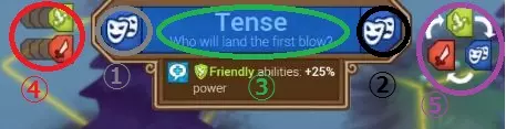 画面上部的态度窗口:1(灰色)是自己当前的态度,2(黑色)是对方当前的态度,3(绿色)显示当前结果氛围为紧张(Tense),4(红色)是再使用几次与当前态度不同的技能后态度就会发生变化的计量条,5(紫色)可以确认三消情况。基本规则如下: - 根据对方的态度,通过三消来使用有利的技能。 - 使用技能会获得1点,发动终结技会额外获得1点,积累到1或3或5点时态度就会发生变化(不同氛围下数值不同)。 - 激进(aggressive)对“最终态度”的影响比另外两种态度更强。例如,若想以友好(Friendly)胜利来获取奖励,当使用友好→友好→激进的技能顺序时,会被判定为【激进胜利】,这种情况会根据使用了哪些技能以及对多少人造成了致命一击等因素而有所不同。如果想要以特定方式获胜,就要好好观察量表的平衡,注意不要过度使用同一种技能。 在【情感遭遇战】中,除了态度和氛围外,还有【感情】这一要素。与态度和氛围不同,【感情】是每个单位各自拥有的。 【感情】有9种状态: - 【中立】:初始状态,没有特殊效果。 - 【暴躁】:略微倾向负面的状态,此时没有特殊效果。 - 【愉悦】:略微倾向正面的状态,没有特殊效果。 - 【积极印象】:因受到打动等而被吸引的状态,【言语差异】降低25%。兴奋:受到“兴奋”等效果影响处于喜悦状态,【口才】提升25% 信心十足:受到“鼓舞”等效果影响变得精神焕发,【攻击】提升25% 愤怒:受到“激怒”等效果影响处于愤怒状态,【防御】降低25% 悲伤:受到“悲伤”等效果影响处于难过状态,【口才】降低25% 恐惧:受到“恐吓”等效果影响处于害怕状态,【攻击】降低25% 感情带来的百分比影响相当显著。【友善】技能对友方使用时,可恢复【精神值】,同时将其感情向积极方向转变。